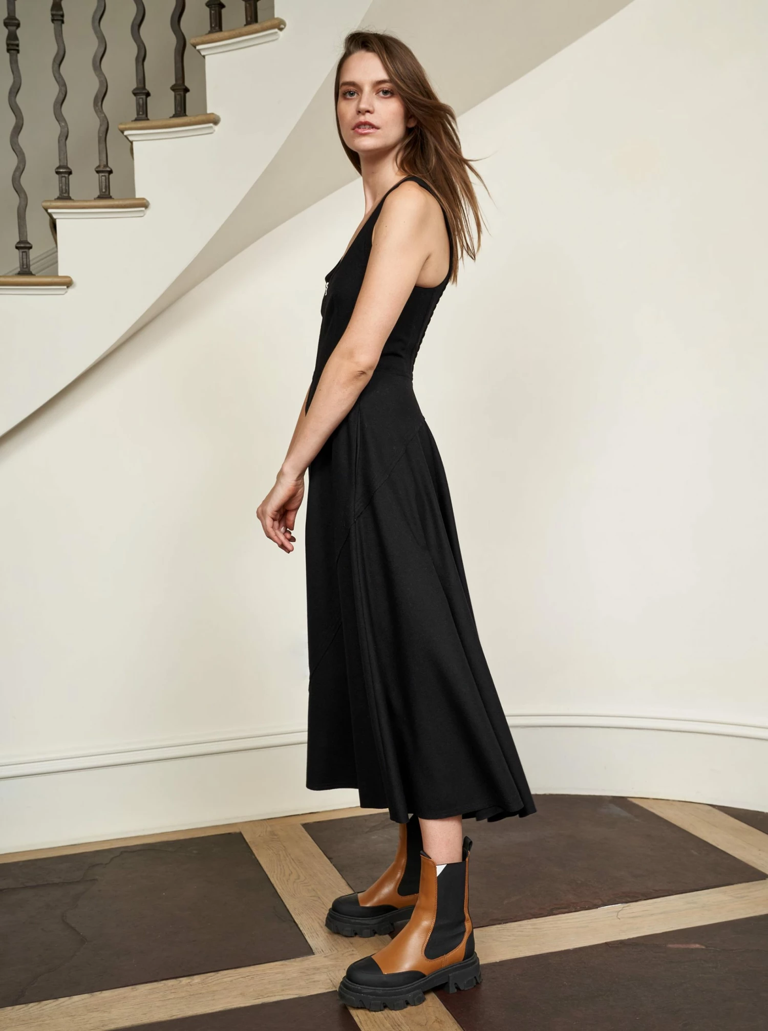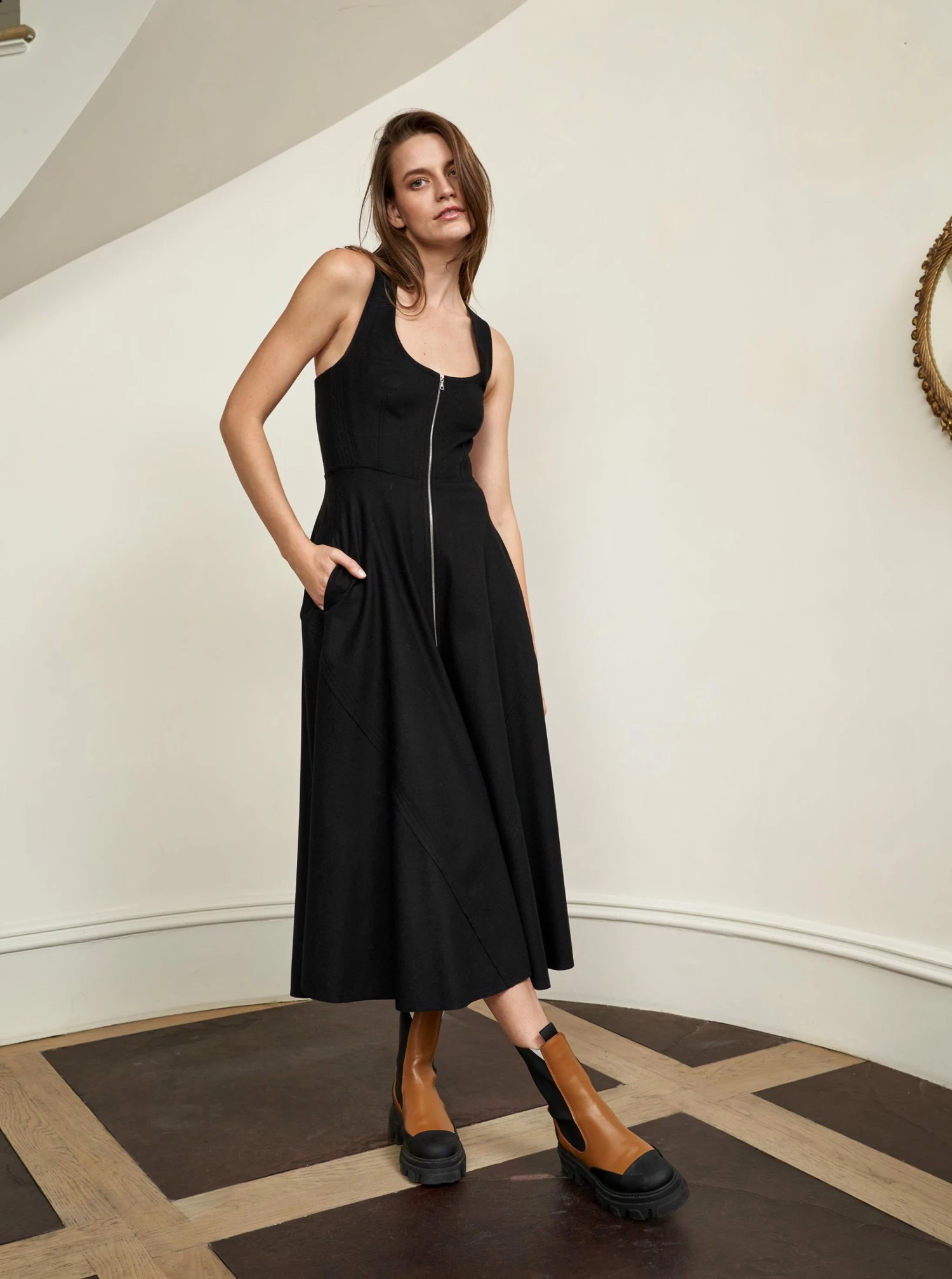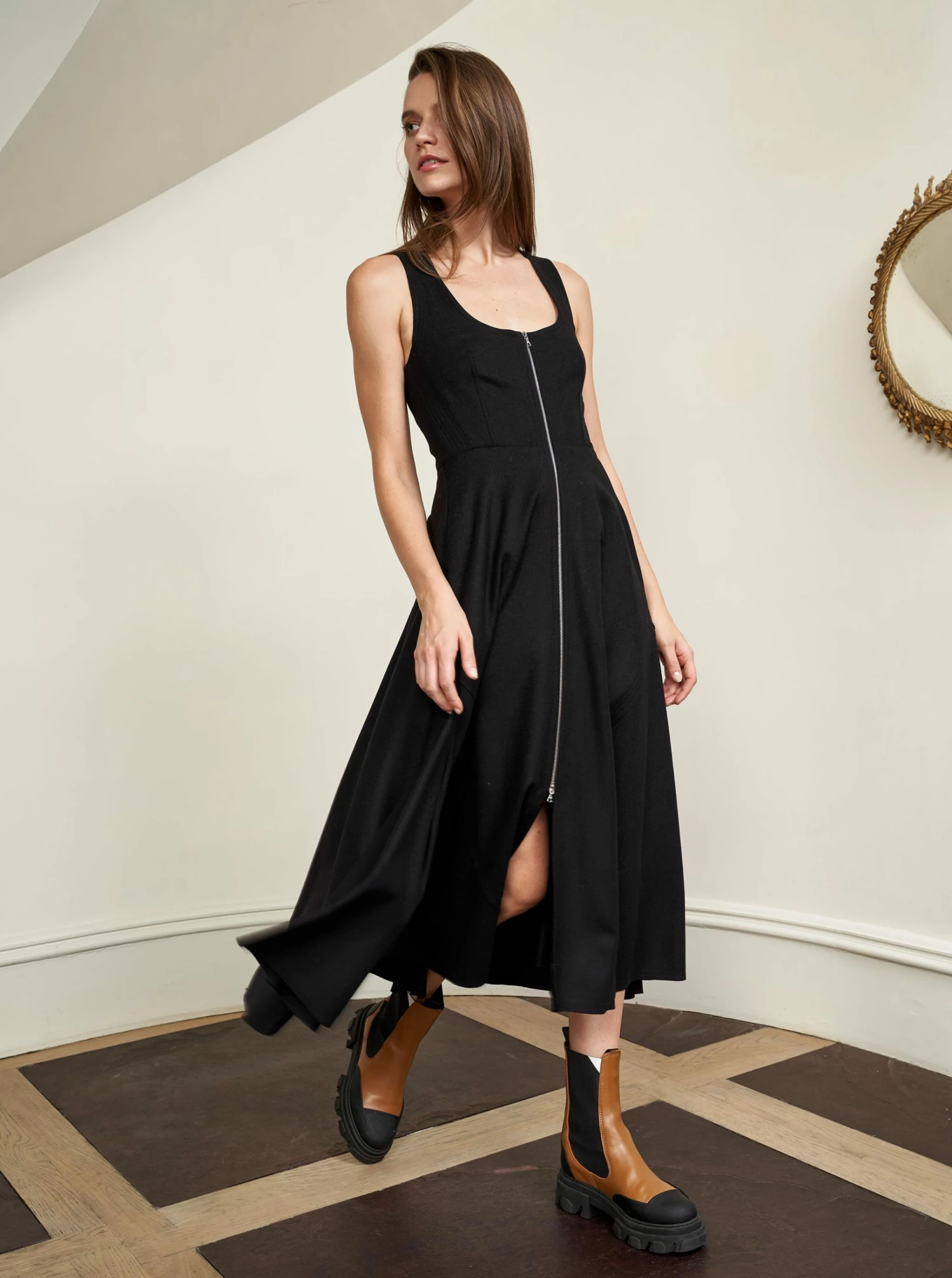 Inspired by La Bande member Selby Drummond, this black, sleeveless dress with smocked back for ease and a two way zipper to show as little or as much décolleté (or leg) is where comfort meets chic. Elevated with a hint of sport, feel free to run away with this dress in a flat boot or simply strut into a room when you wear it with heels. Just like Selby, there is nothing this dress can’t do.