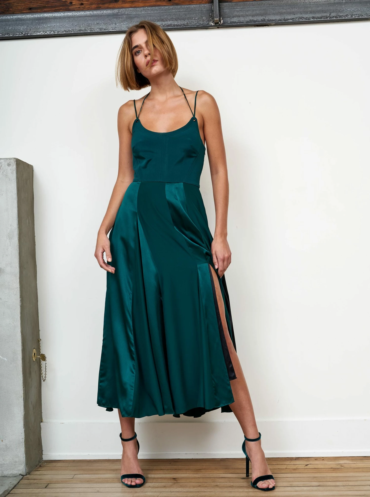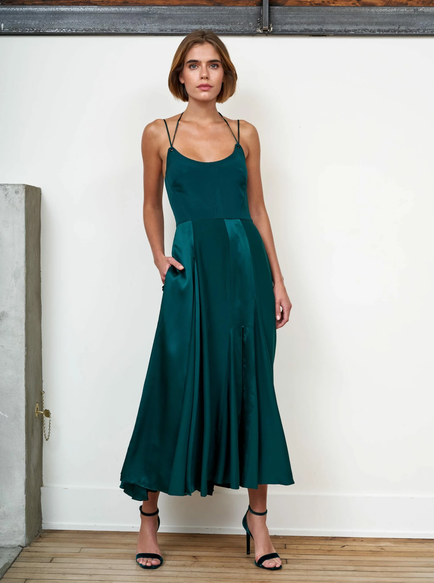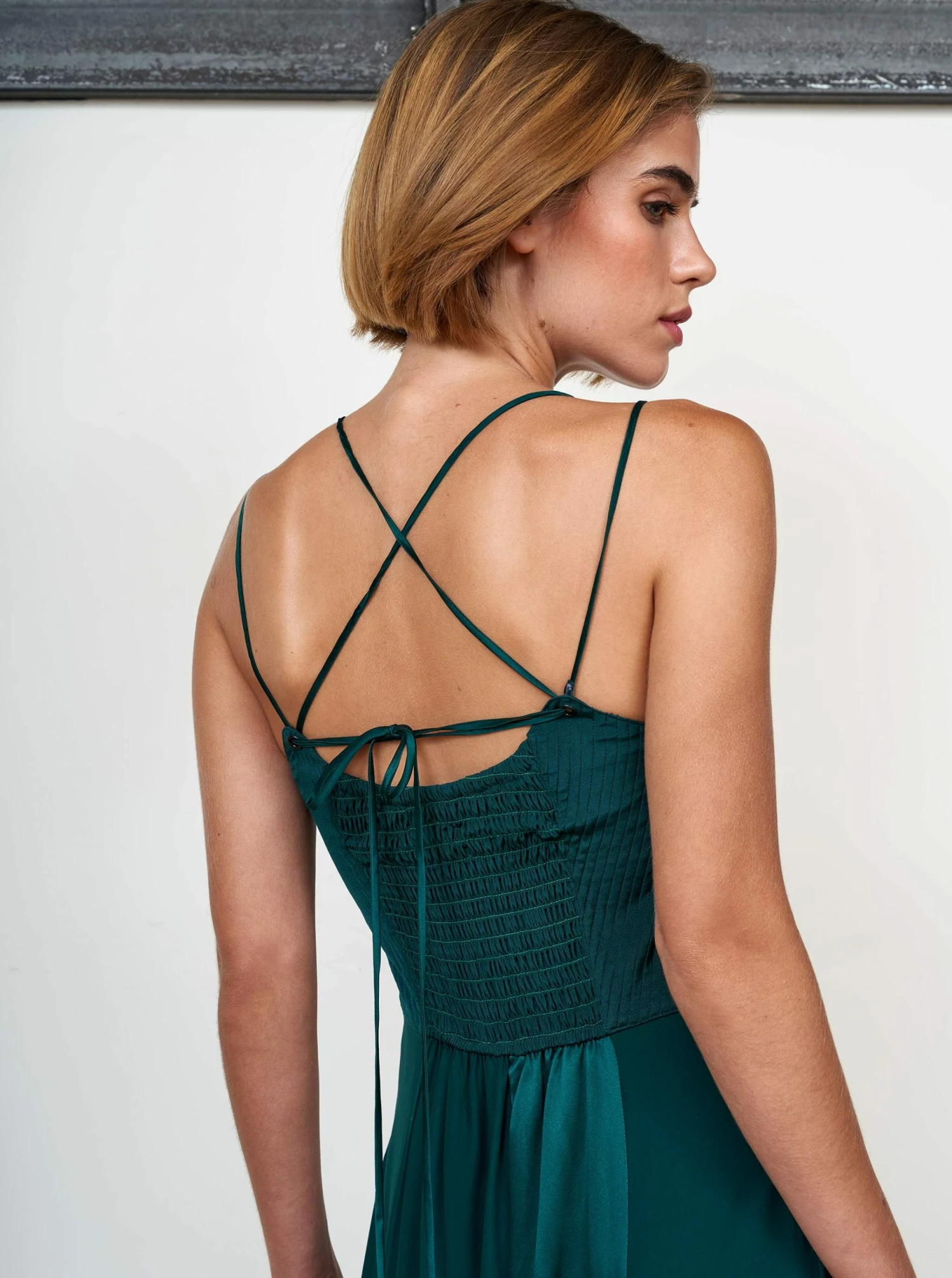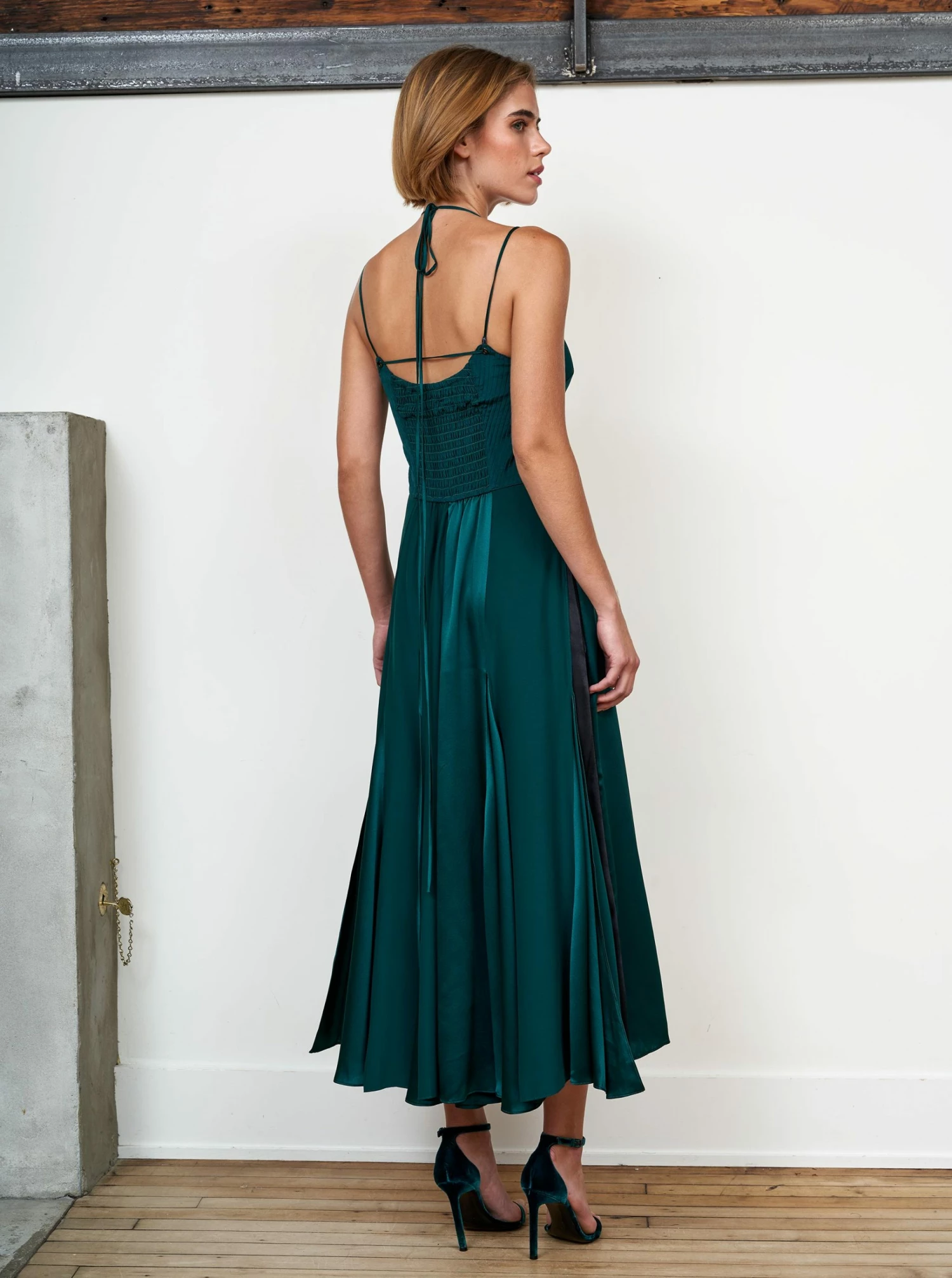 This dreamy, emerald silk dress features matte and shine panels with a navy lining that peeks out of side seam slits. And let’s not forget the smocked back and adjustable straps to ensure that this dress fits you like a glove.