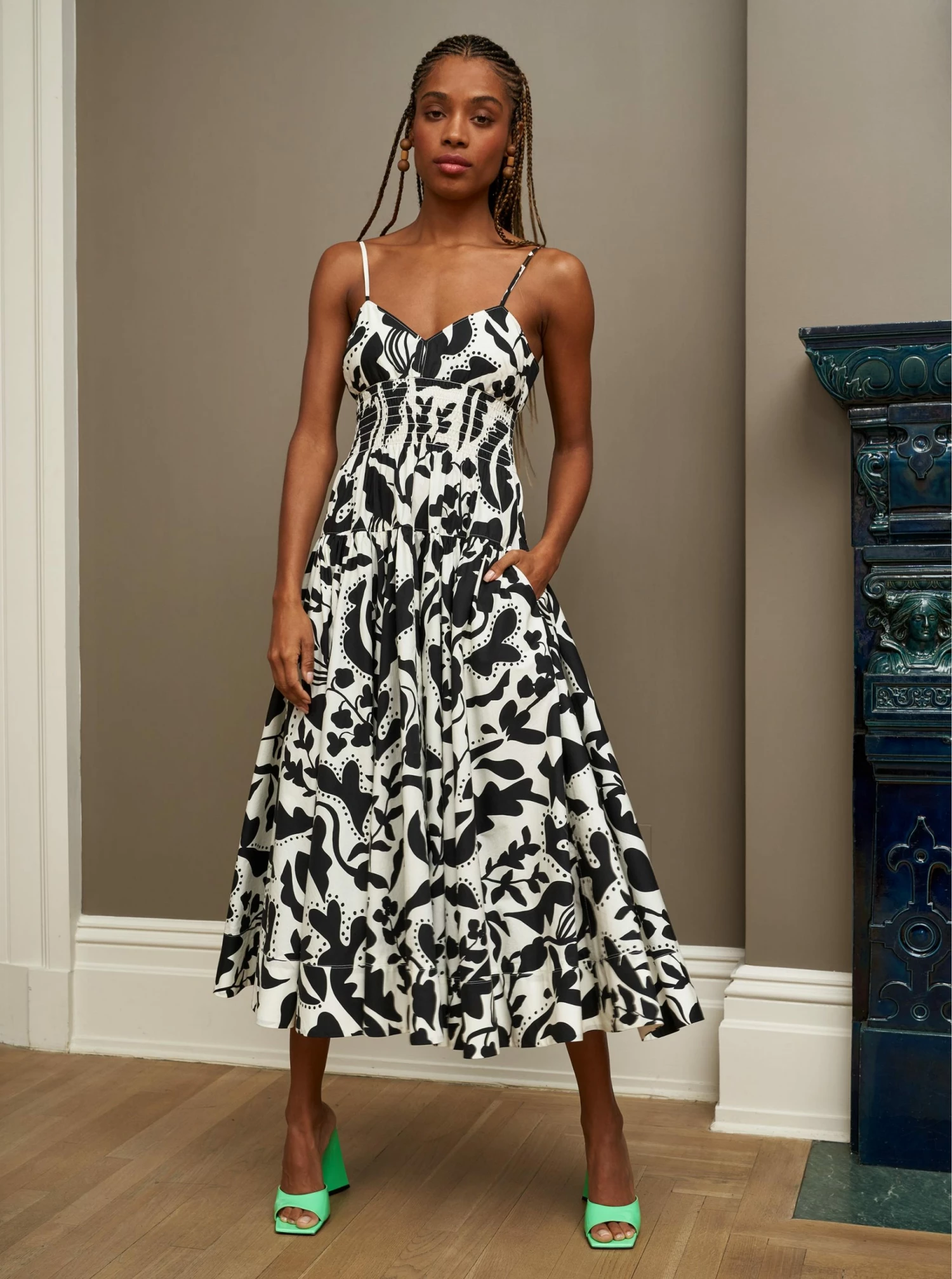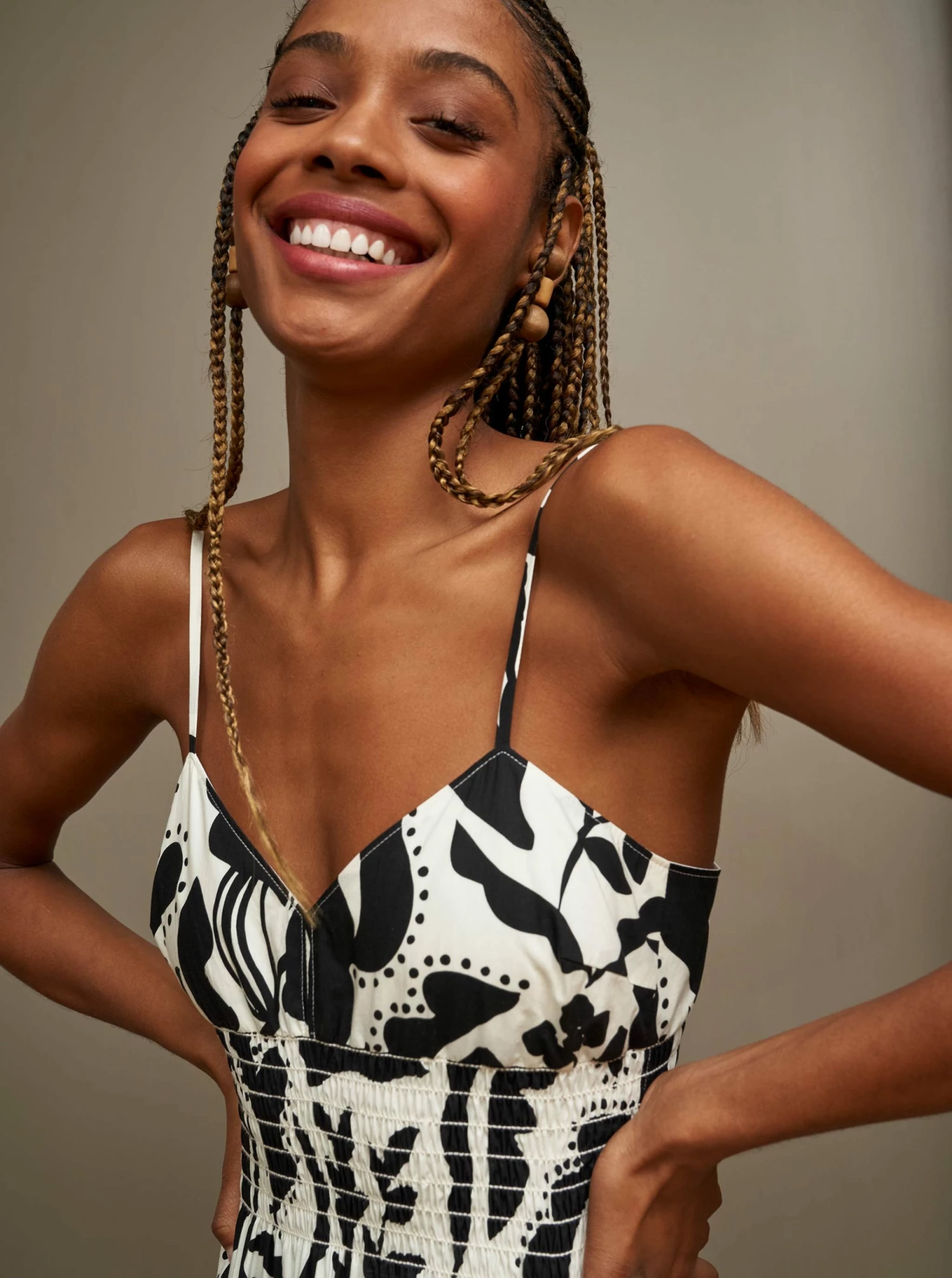 Make a Beeline for this crisp, ivory and black, cotton poplin stunner. With a fitted bodice, elasticized waist and adjustable straps this dress was made to Bee the perfect fit.Â