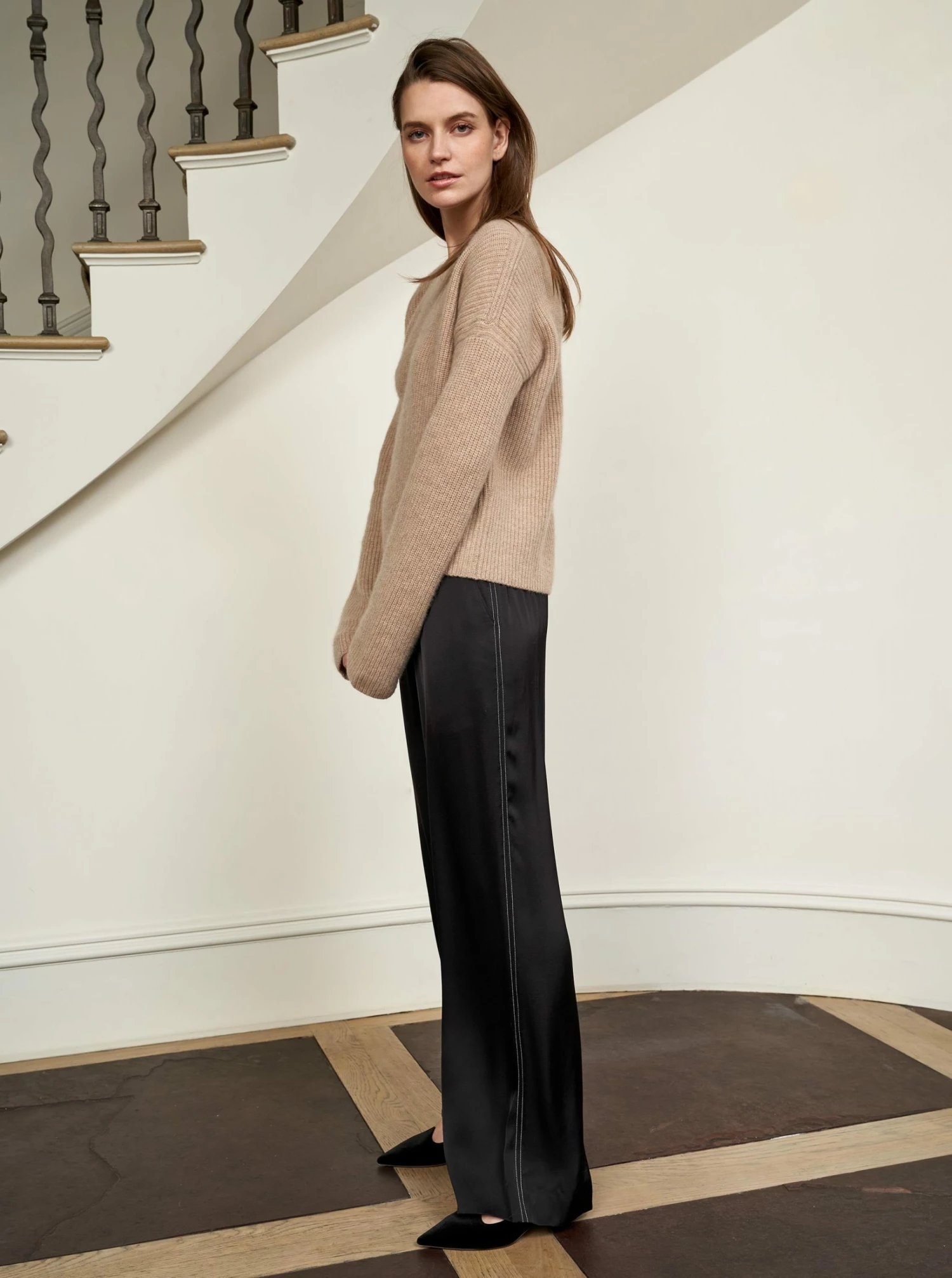 This is the pajama pant that’s too good to sleep in. This silky pull on trouser is a mood all its on so pair it back to our black Toujours Sweater and a sneaker for casual glam or go luxe with our Fine Line Polo Sweater and heels. Wearing your pajamas all day has never looked so good.
