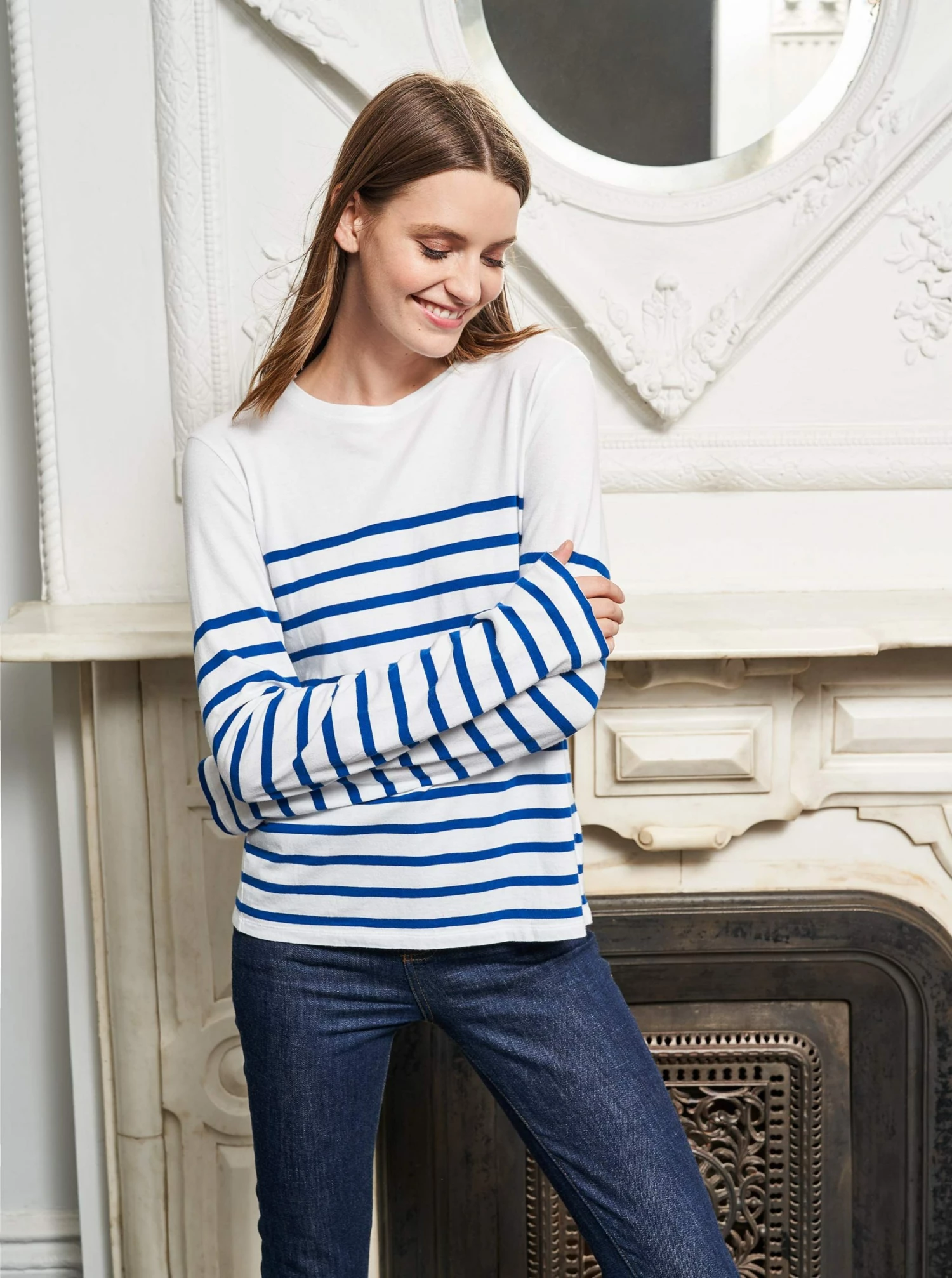 Our classic long-sleeve tee – a wink at iconic French style – with yarn-dyed bright blue stripes in lightweight cotton.Â
