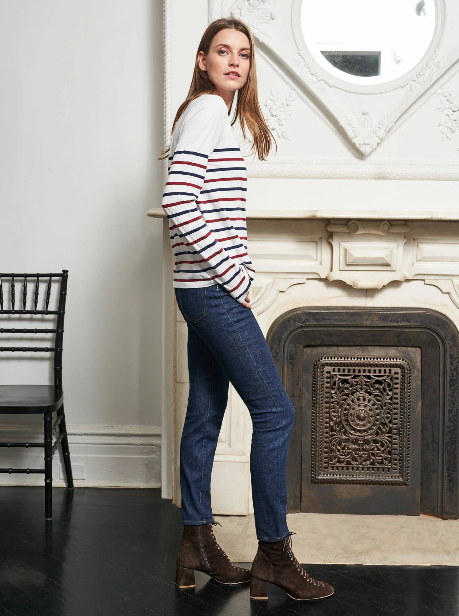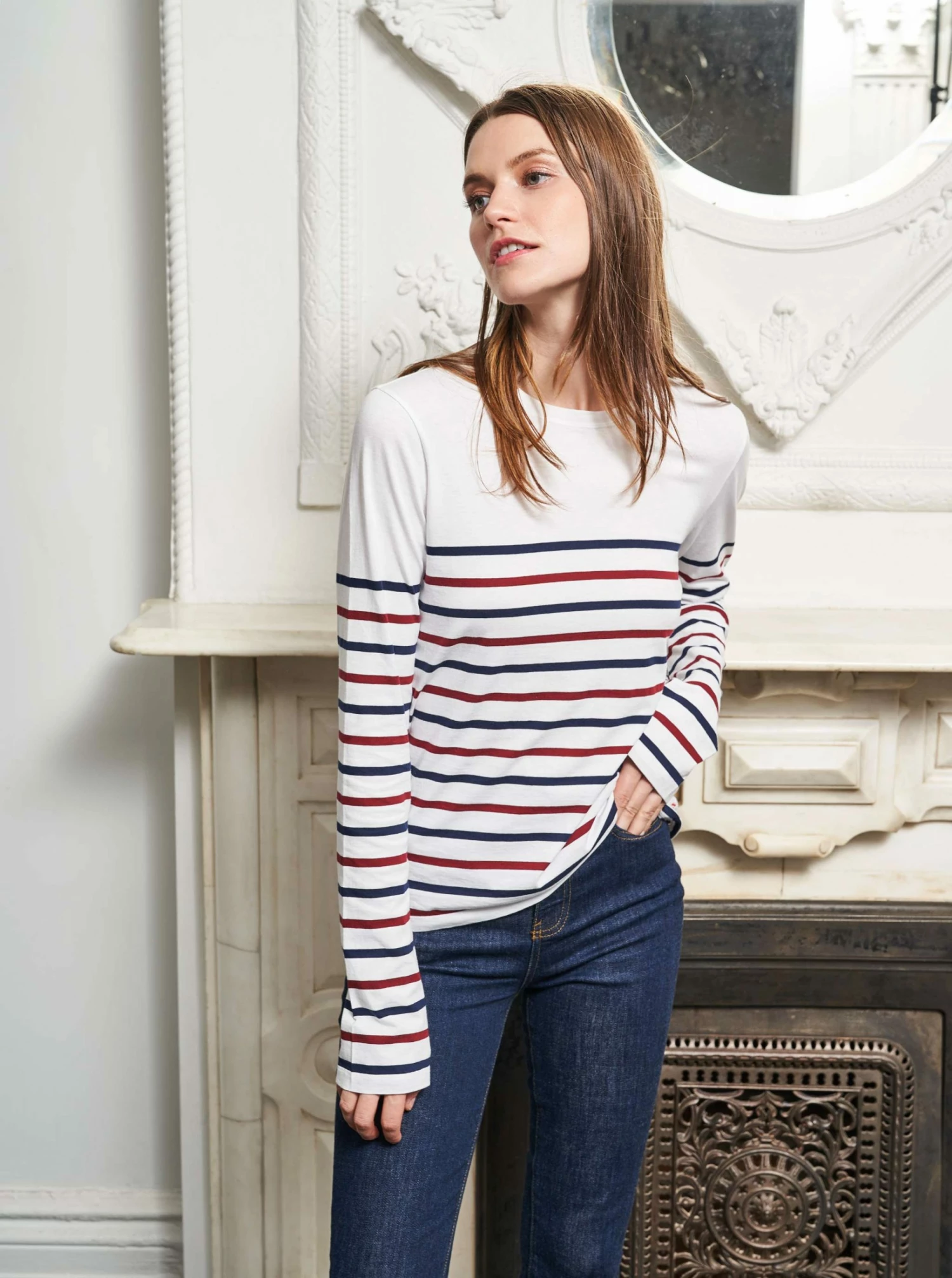 Our classic long-sleeve tee – a wink at iconic French style – with yarn-dyed navy and burgundy stripes in lightweight cotton.