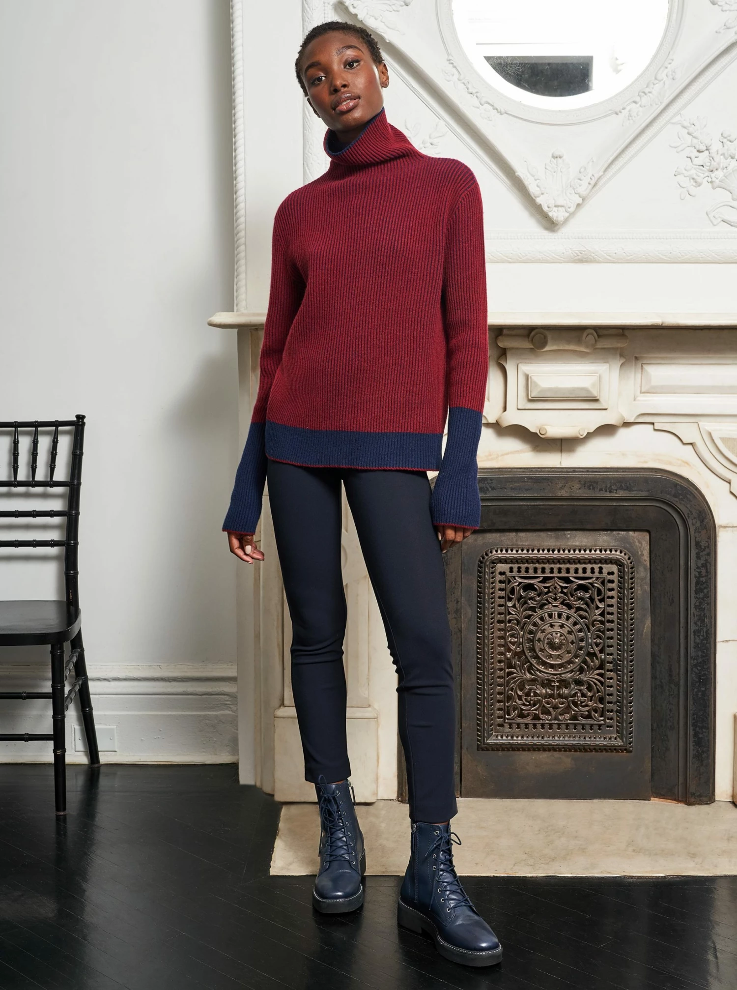 This will be your favorite turtleneck to bundle up in come winter. Its baby-soft burgundy cashmere and subtle navy detailing sets it apart from the pack.