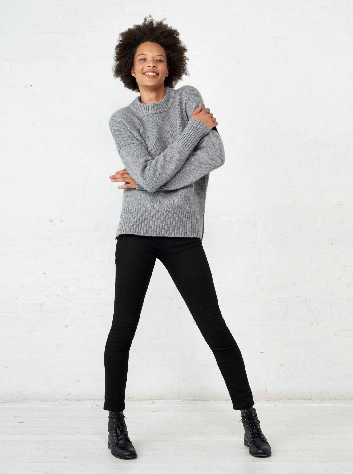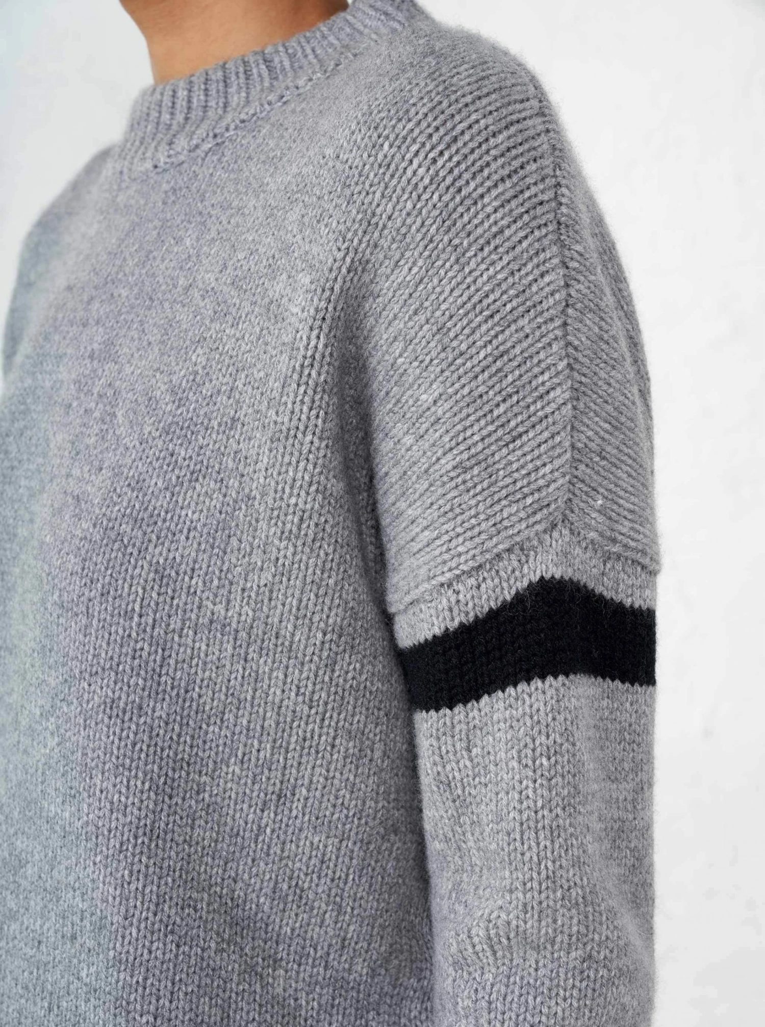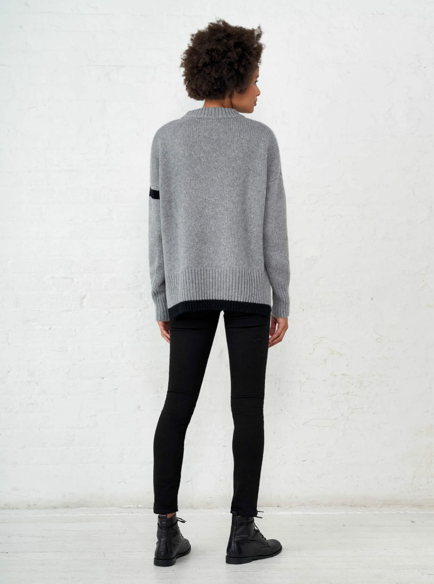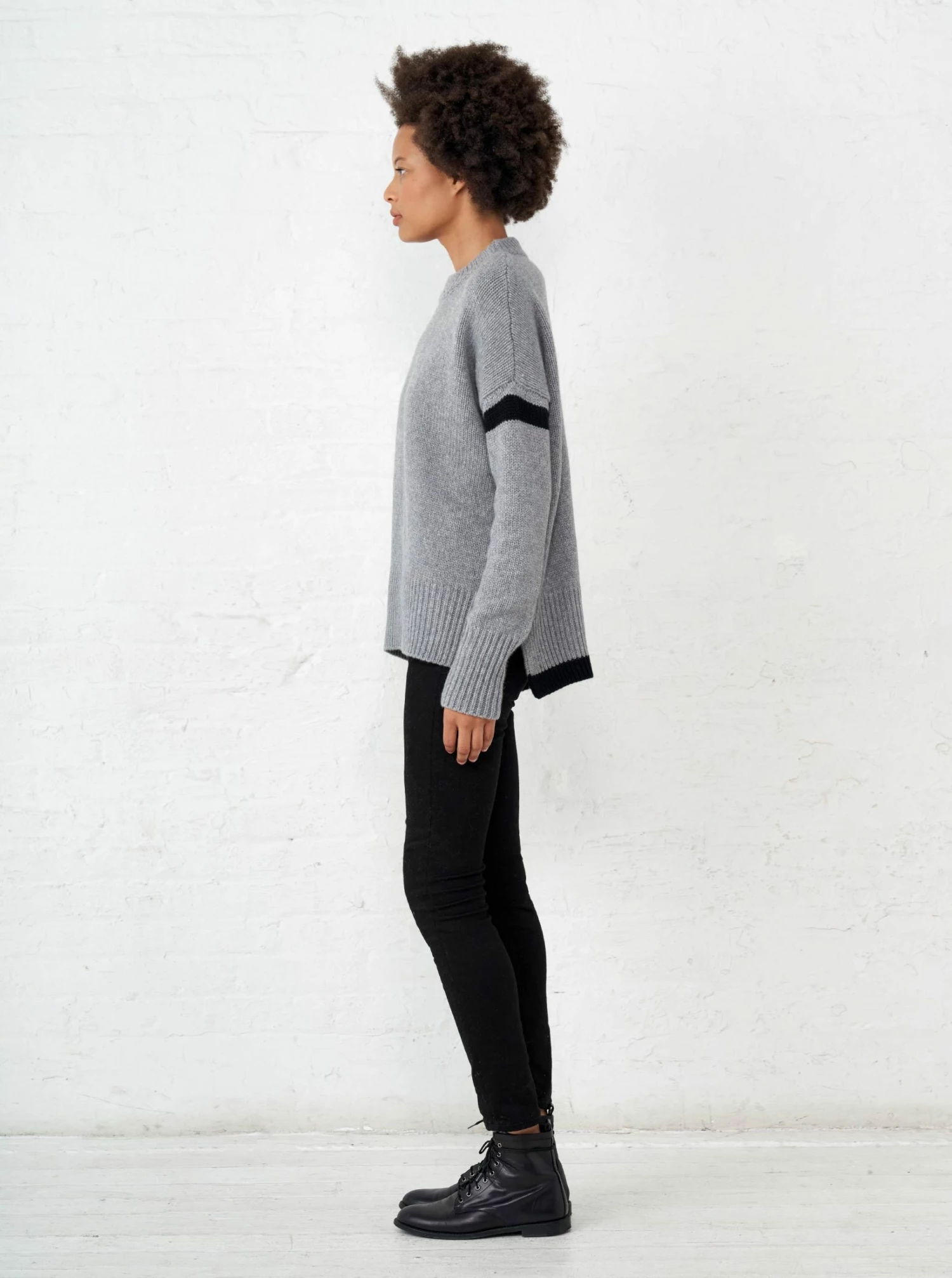 Trust us, you will be living in (and living for) this 7-ply grey cashmere sweater with contrast black stripe detailing this fall.