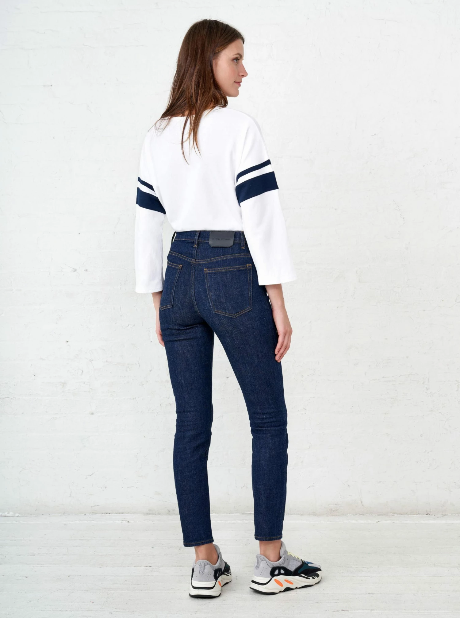 Show your team La Ligne spirit. Wear your stripes on your sleeves in our mid-weight white cotton tee with navy inset stripes.