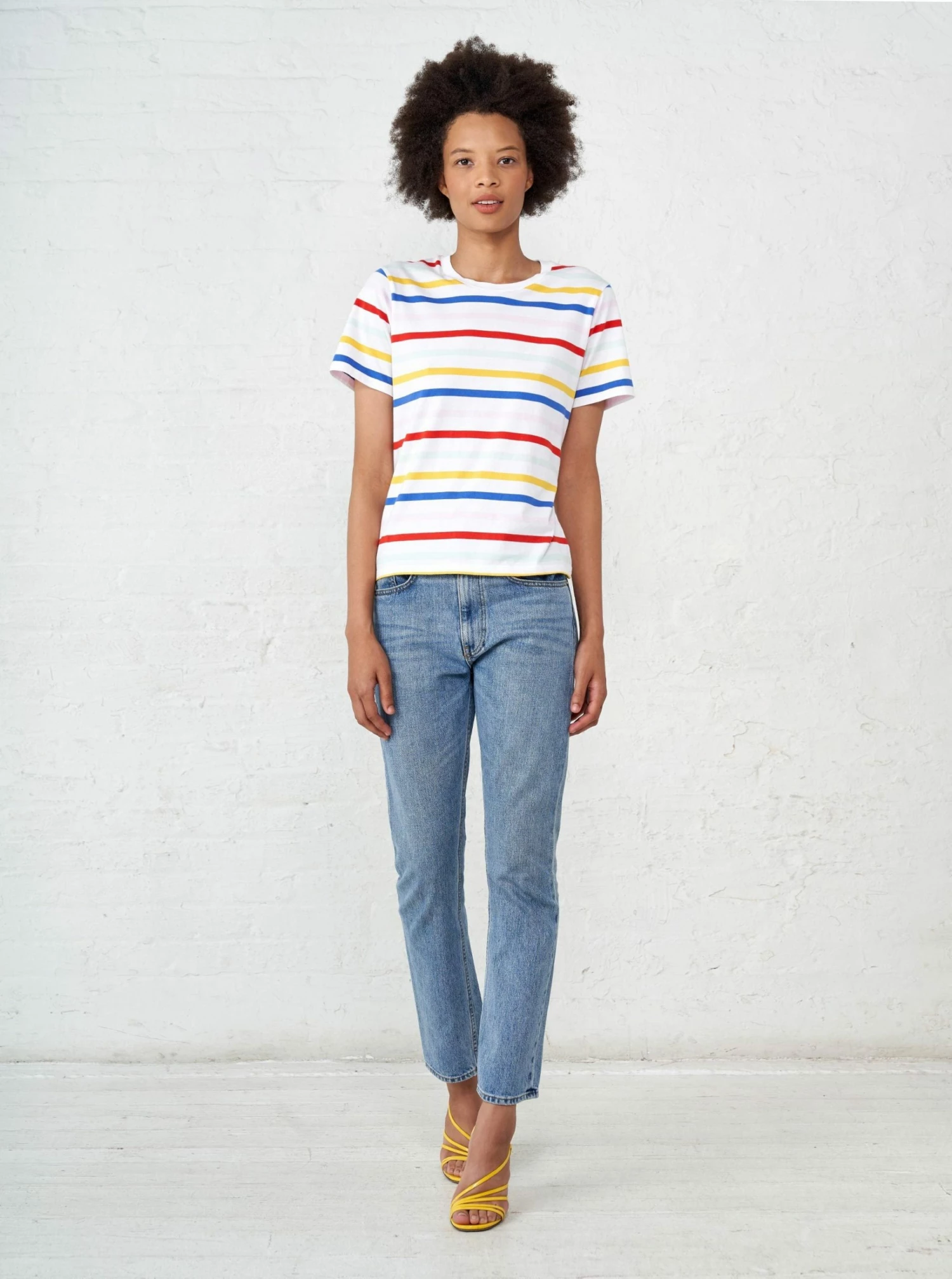 Inspired by the iconic actress Jean Seberg, this tee will channel your inner French girl with style and simplicity wrapped into one. In super soft cotton, this blue and white striped short sleeve tee is your new go to for everyday, all day.Â