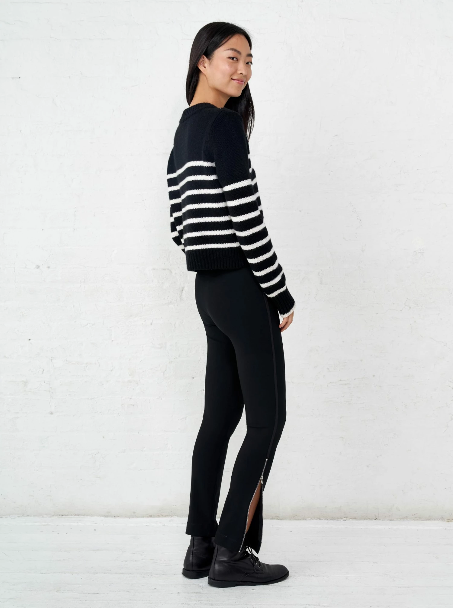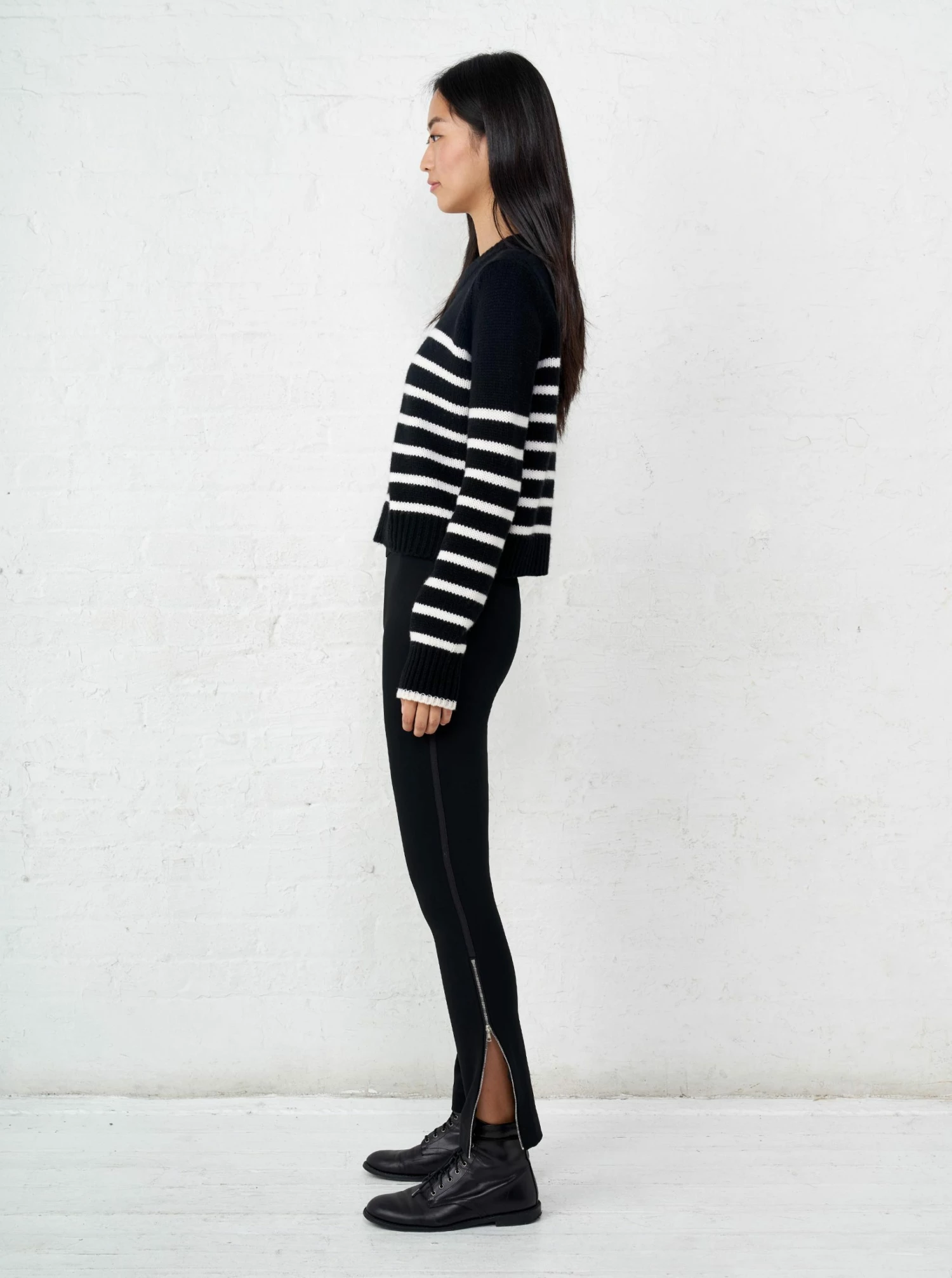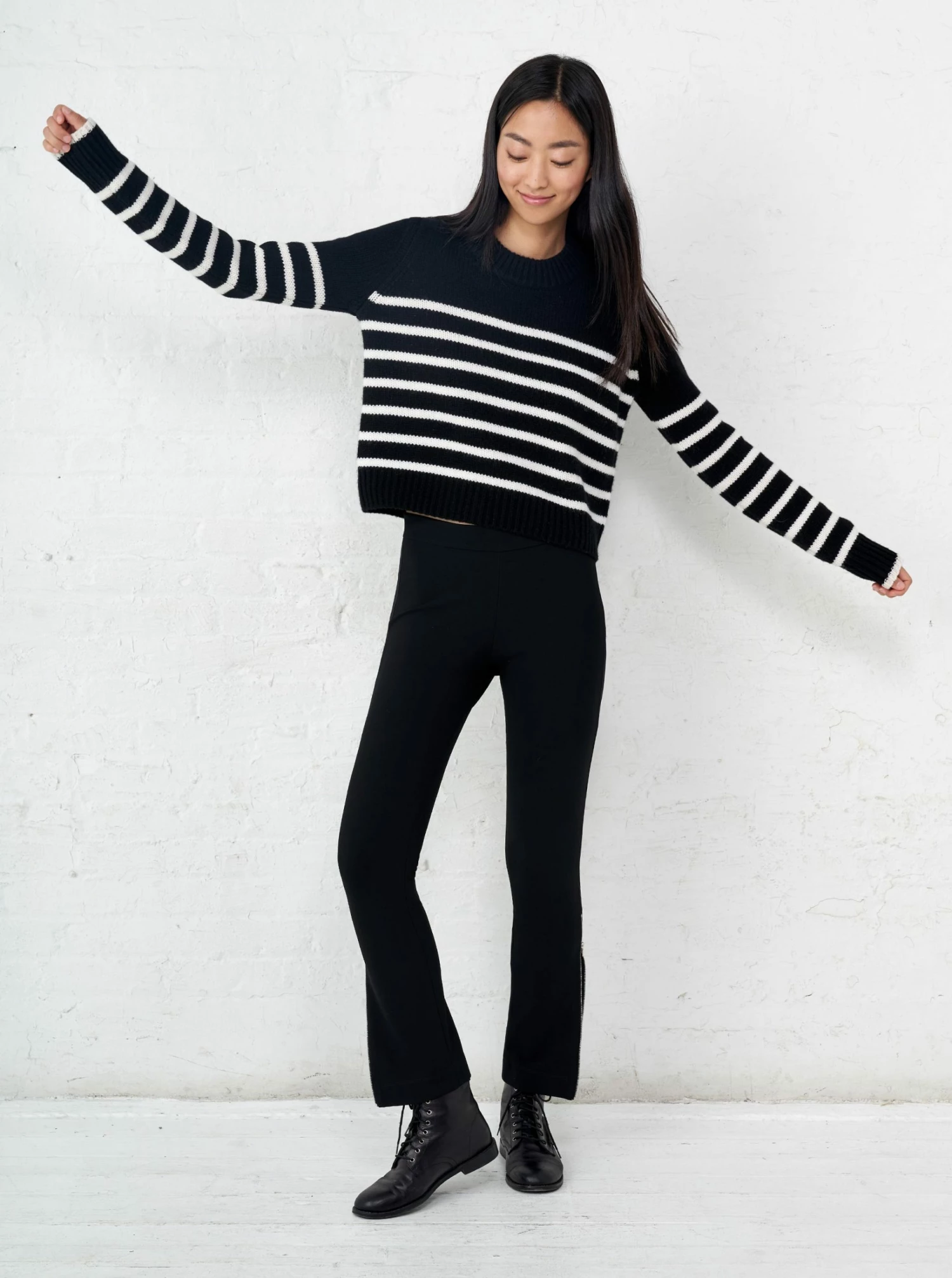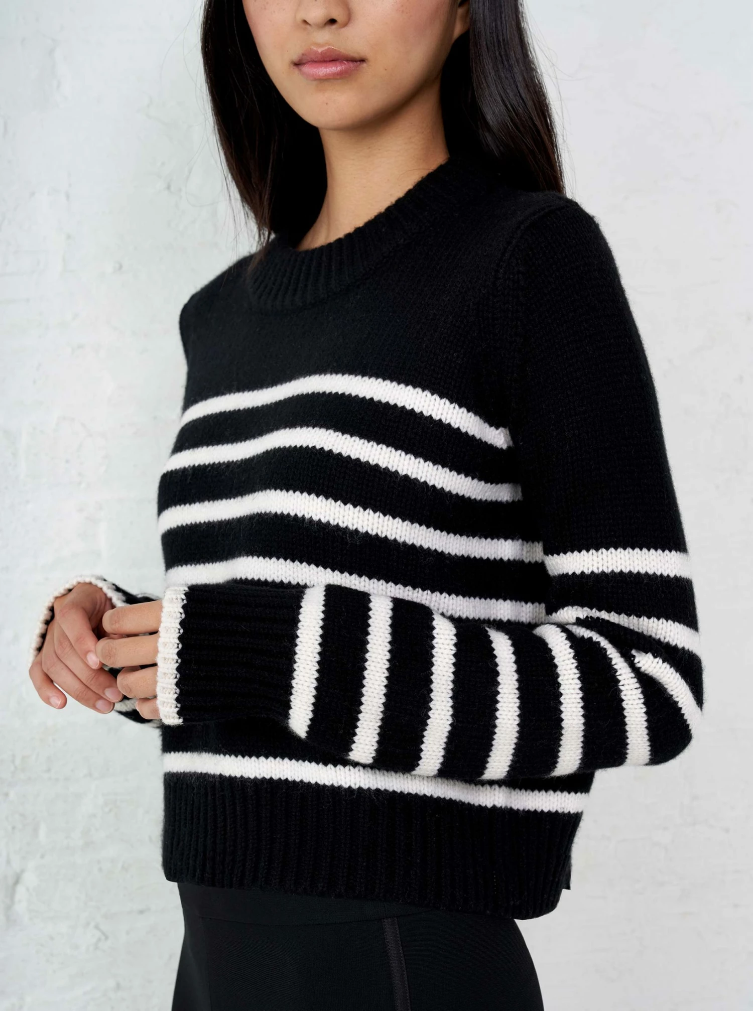 Get on board with our black with cream stripe, 7-ply wool-cashmere sweater, shrunken and slightly cropped, but as always, comfort and style not mutually exclusive.