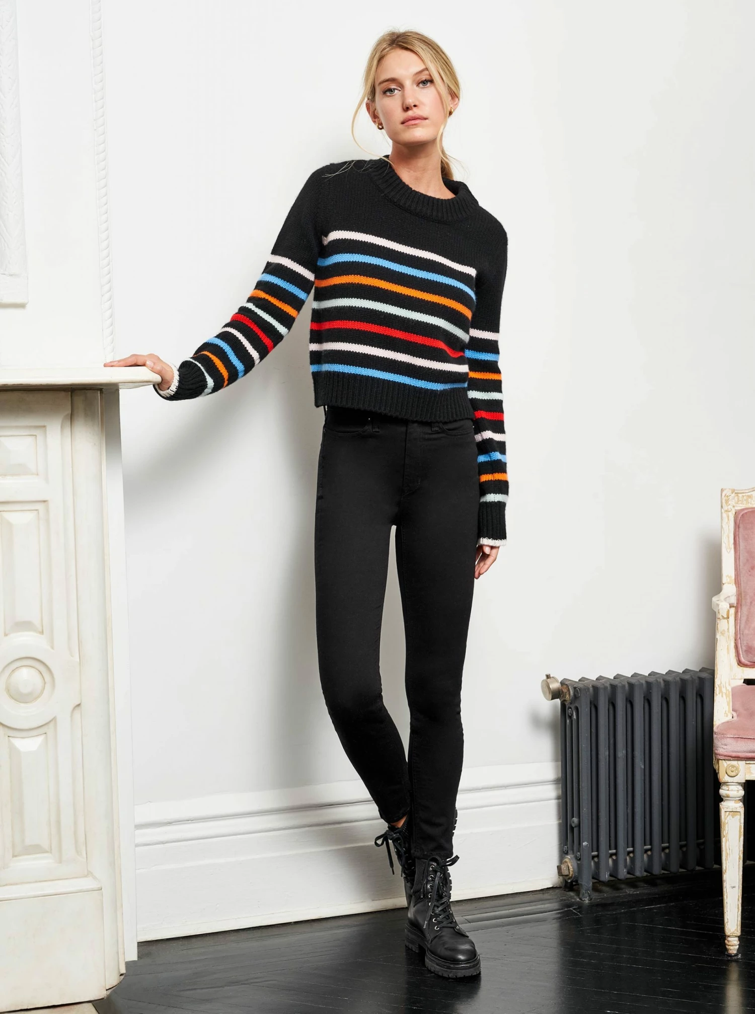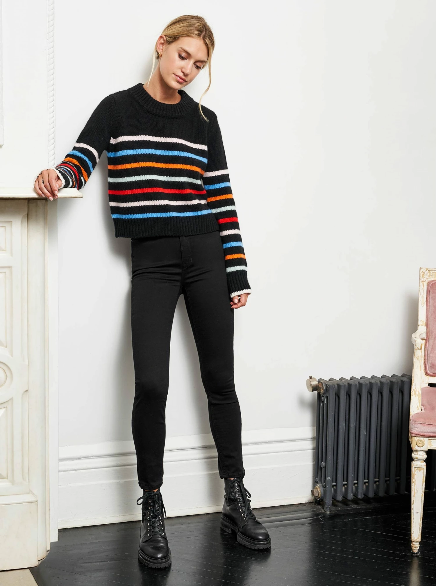 Get on board with our black with cream stripe, 7-ply wool-cashmere sweater, shrunken and slightly cropped, but as always, comfort and style not mutually exclusive.