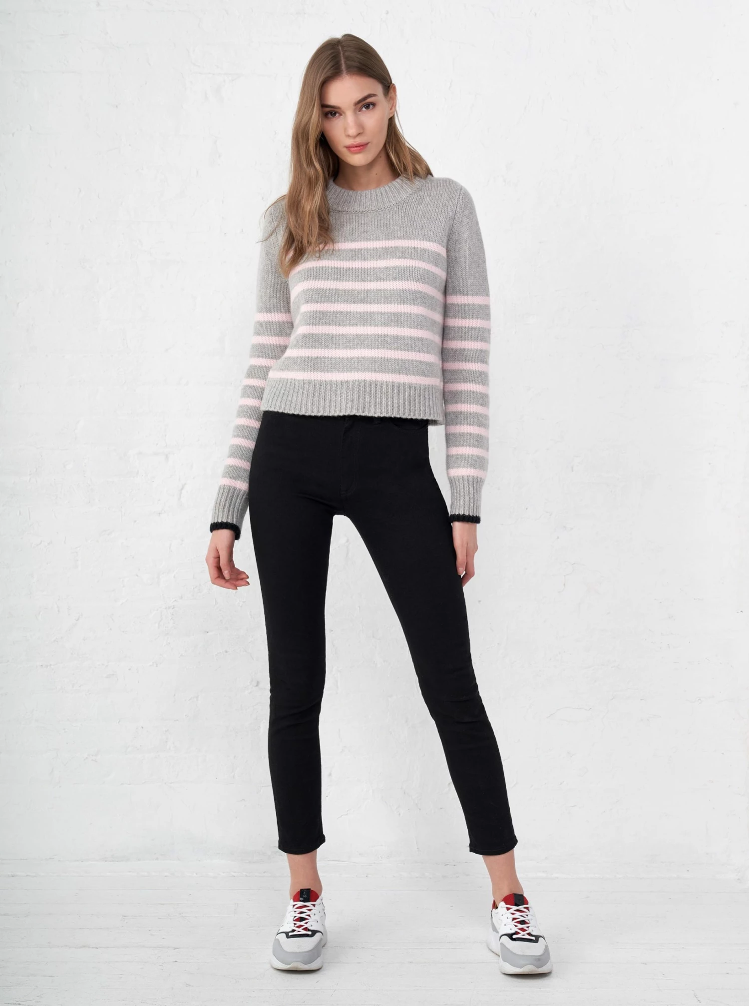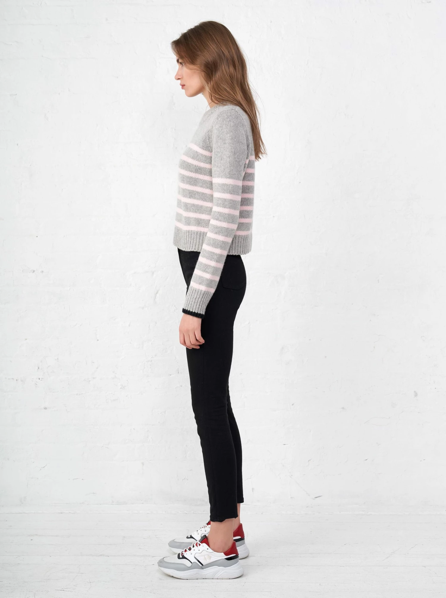 Get on board with our grey with pink stripe, 7-ply wool-cashmere sweater, shrunken and slightly cropped, but as always, comfort and style not mutually exclusive.