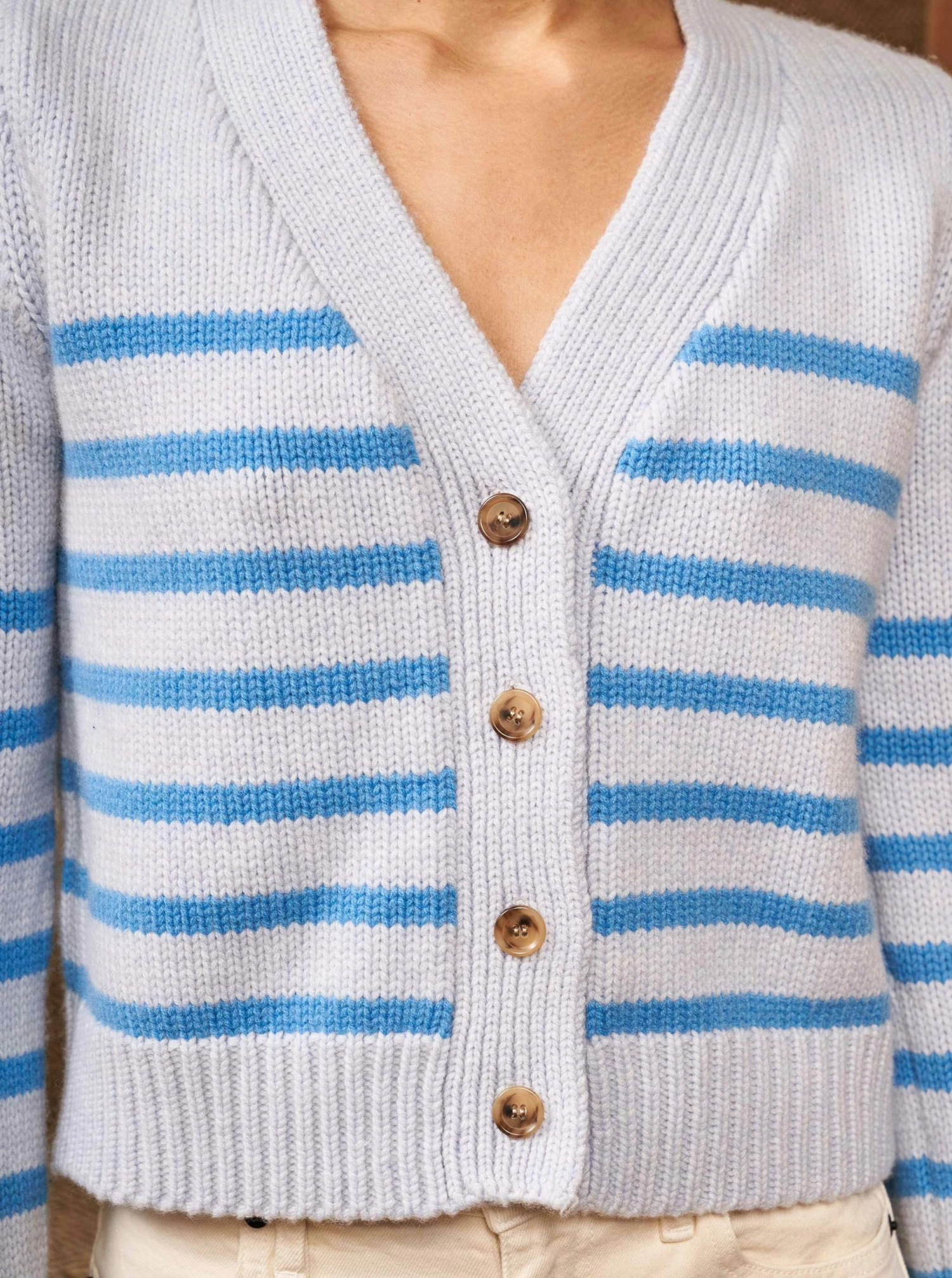 Our newest addition to the Marin family, the Mini Marin Cardigan is just as sweet as sister Mini Marin, with a v neck button front in tonal blue stripes.