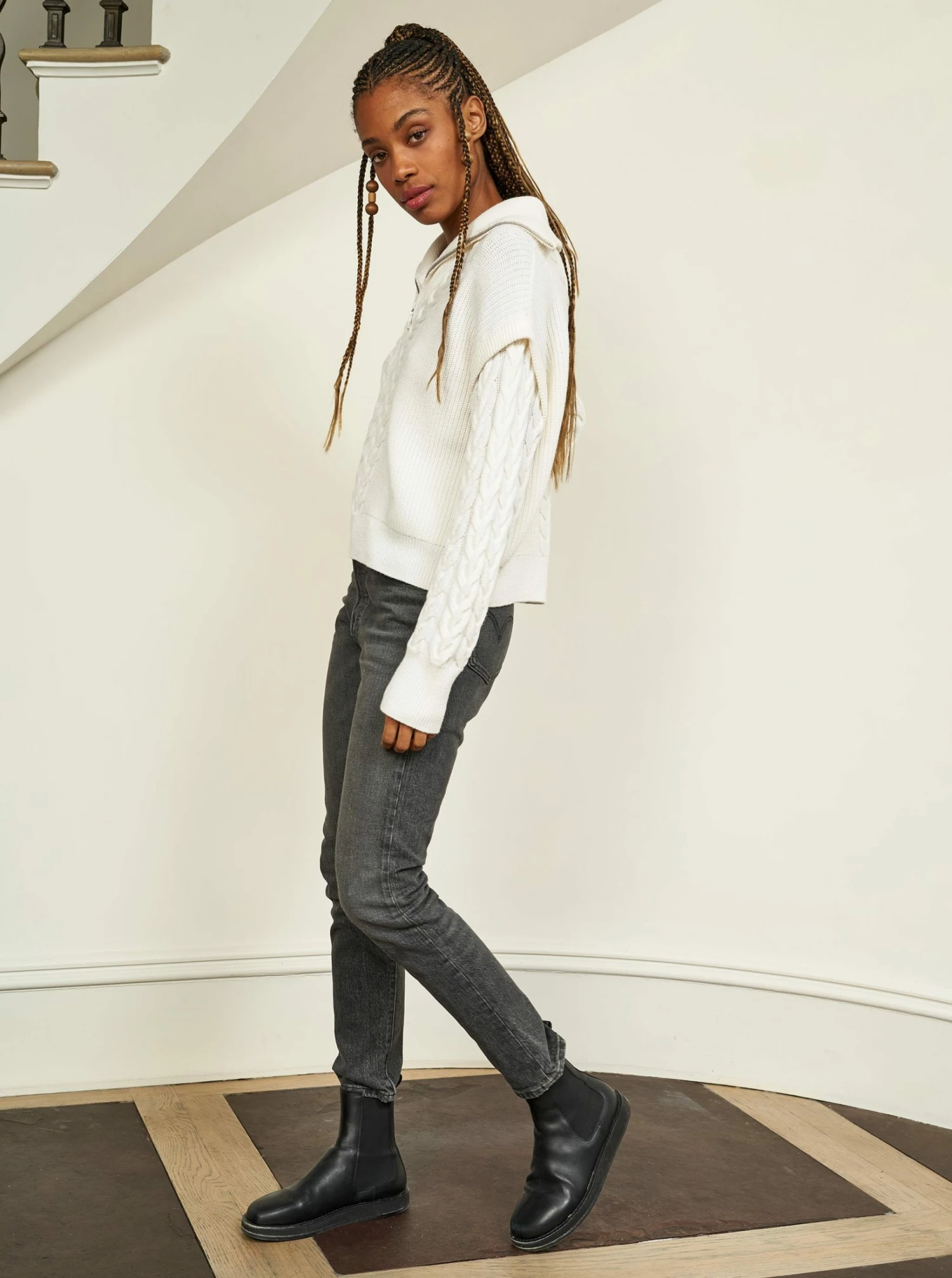 Our Cable Bastien Sweater is the newest closet staple where function meets fabulous in delicious merino fashioned from a borrowed-from-the-boys silhouette.Â