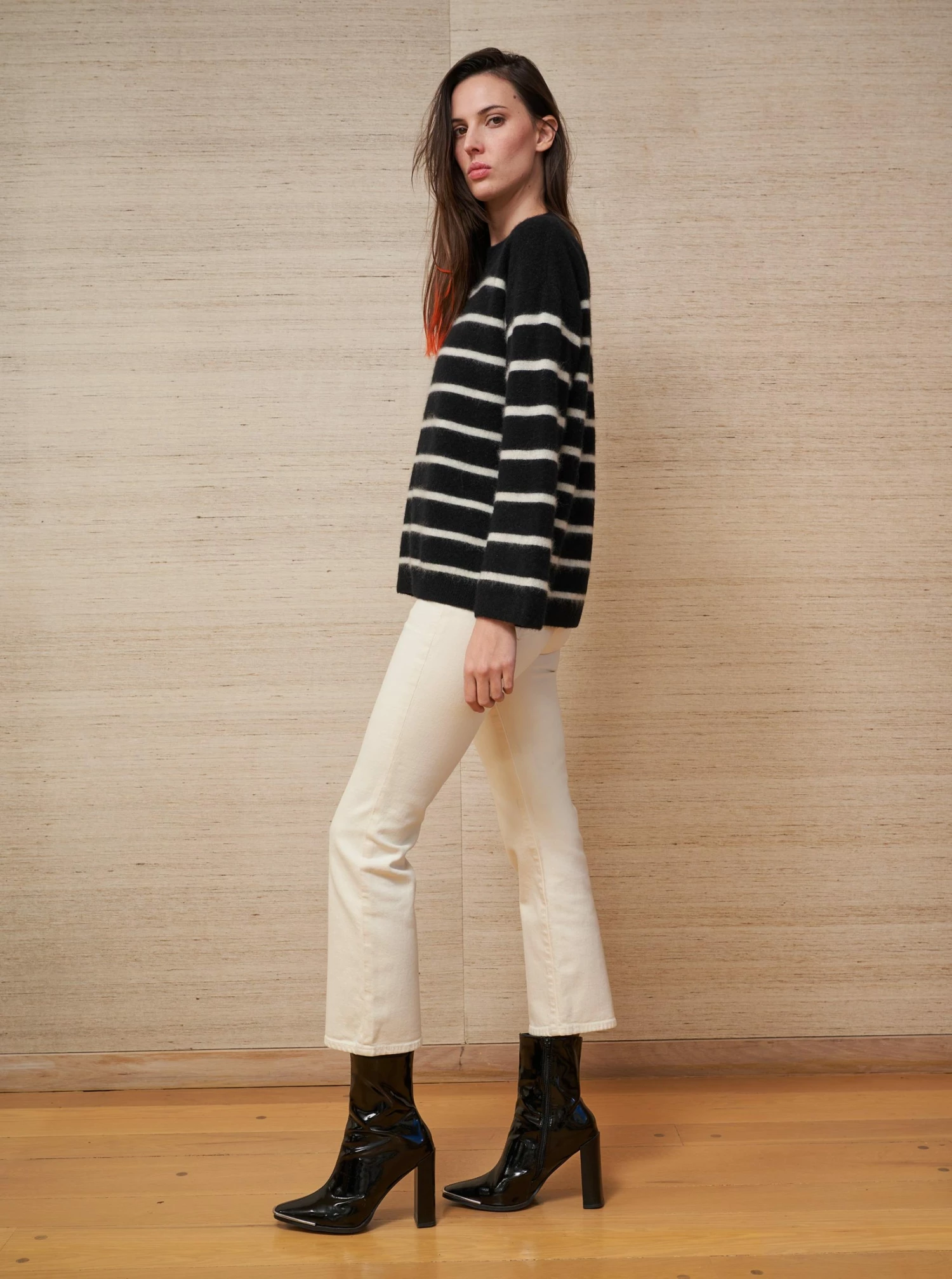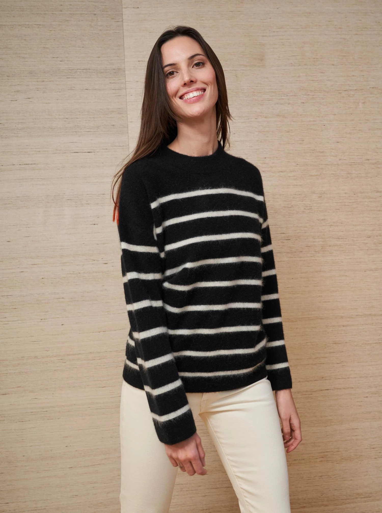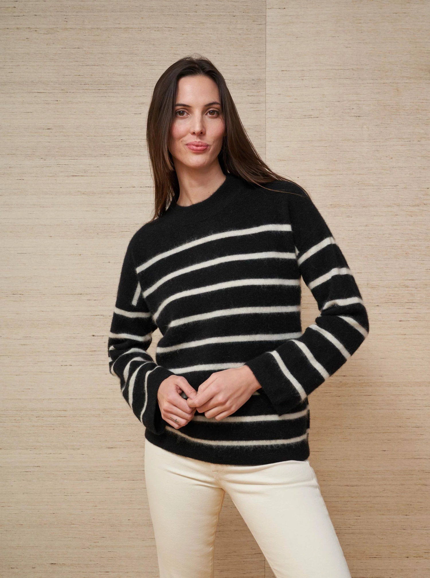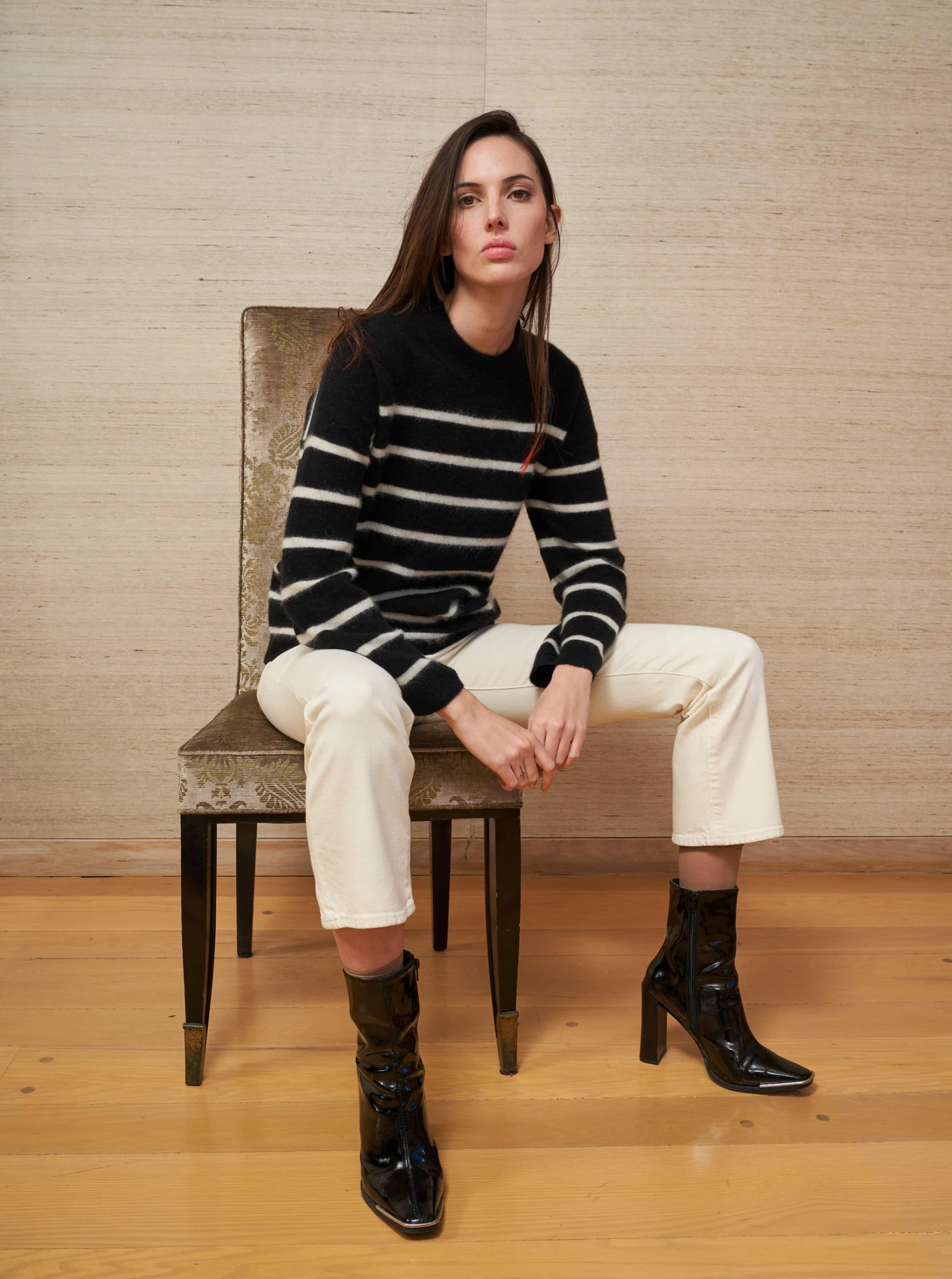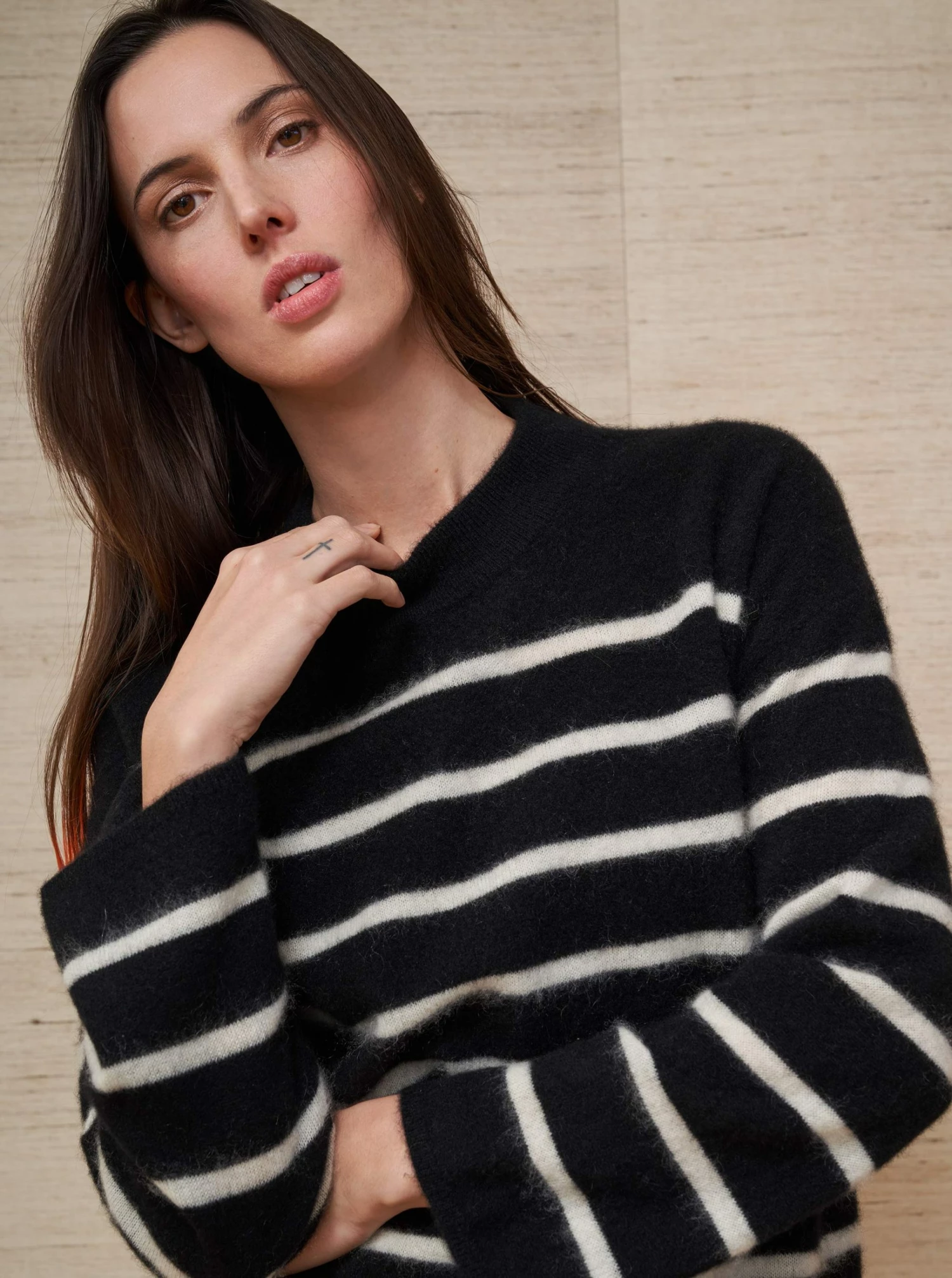 You might just attain that heavenly state in one of our Nirvana Sweaters crafter from deliciously soft brushed cashmere in black and cream stripes. Get it in both colors to extend the bliss.