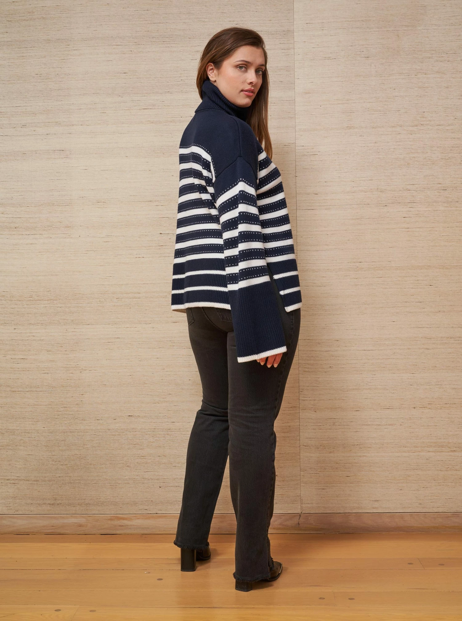 Is there anything better than the perfect oversized, throw-over-anything sweater? We think not. Introducing our Shadow Stripe Turtleneck in our signature, superiorly soft merino wool in classic navy and cream. Looking chic and feeling cozy, check check!
