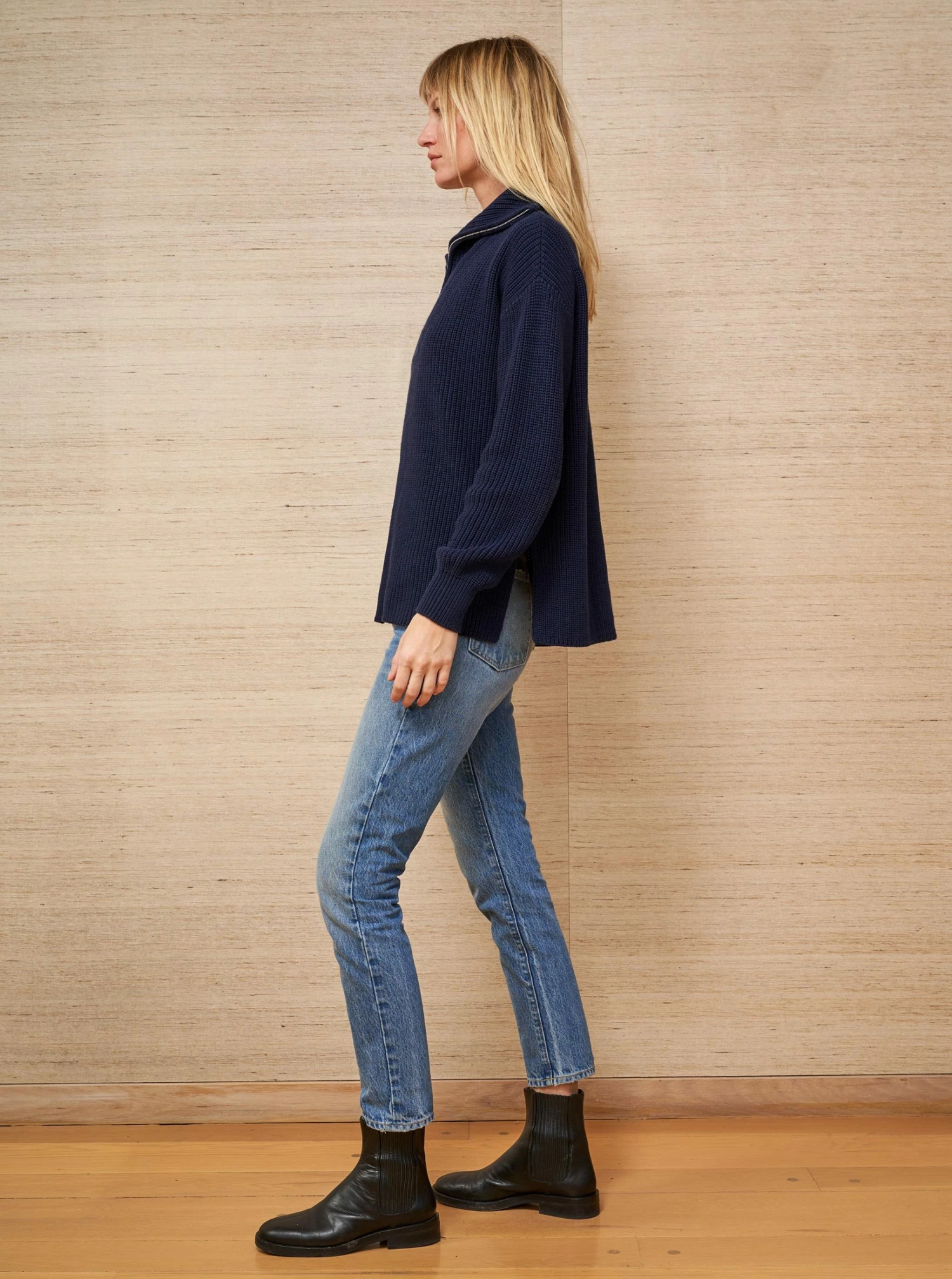 Based off our always-sold-out Bastien Sweater, this half zip is the oversize version in easy cotton with the same ribbed double layer neck trim updated with a ribbed body to match plus side slits.
