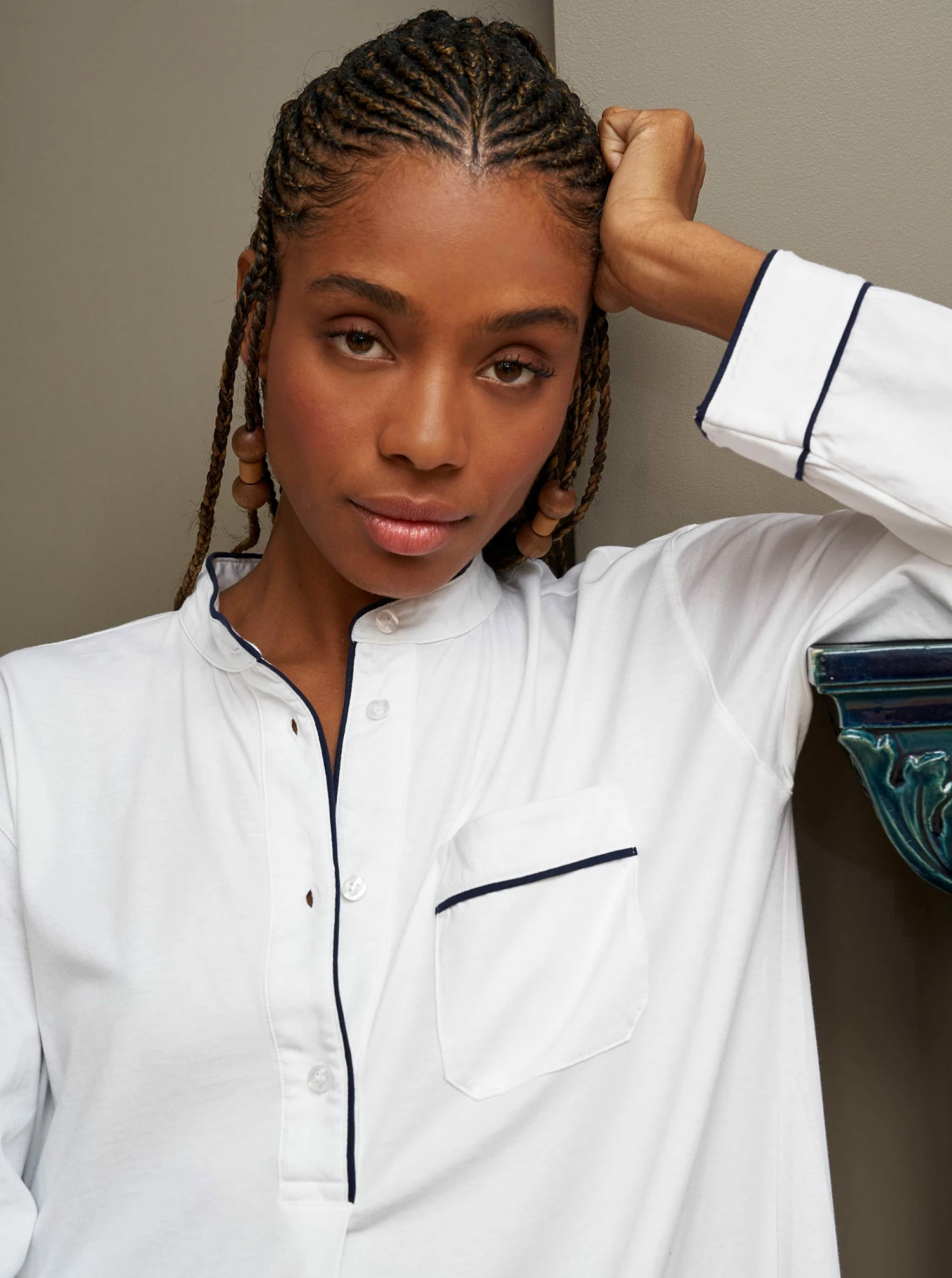 Pajama party ready. Our PJs are cut from our super soft t-shirt fabric for the ultimate in comfort and style when you need a little hygge. White cotton framed with contrasting navy piping, this pop-over night shirt is as relaxed as it comes. Getting ready for bed has never been easier.Â