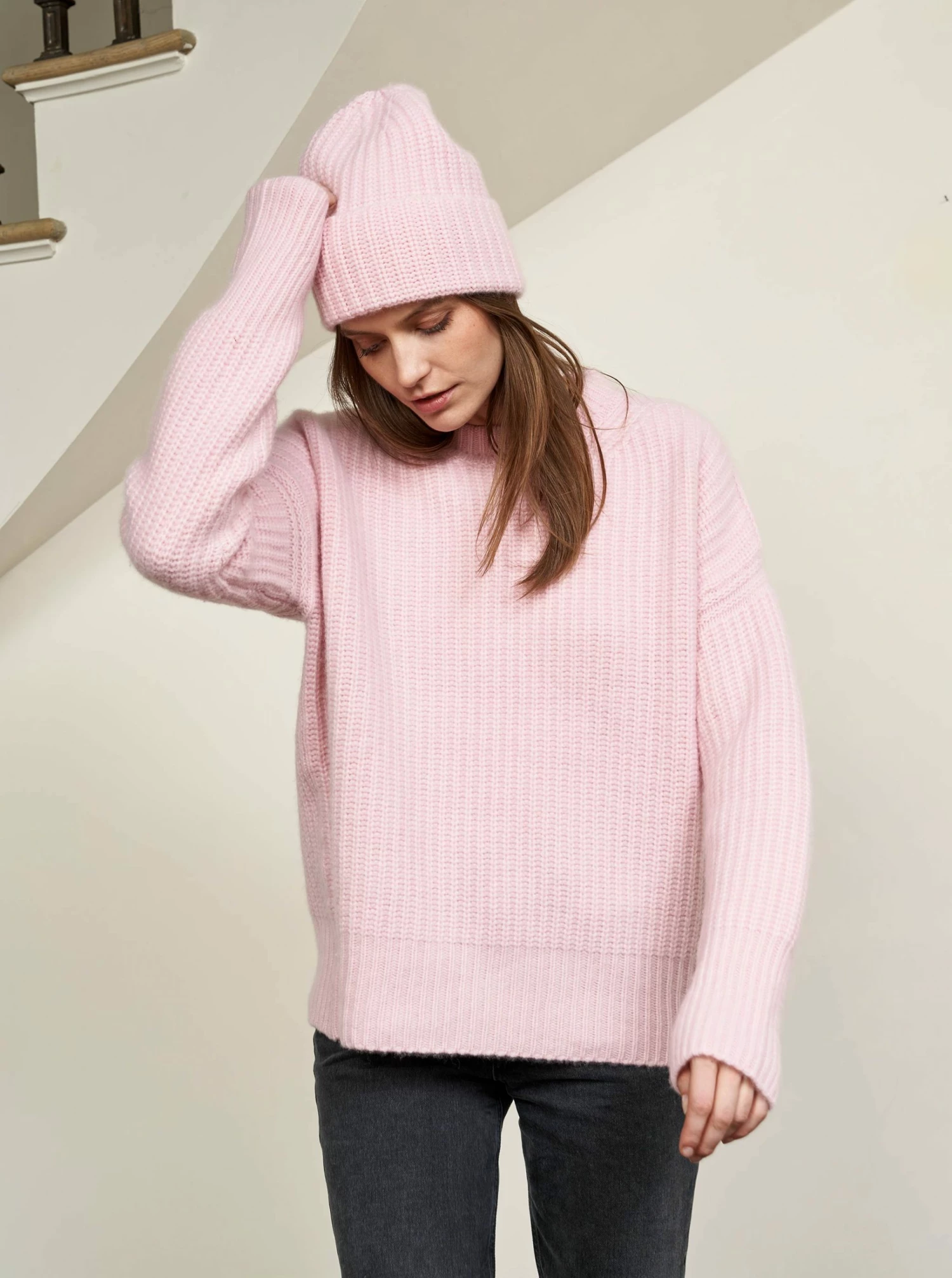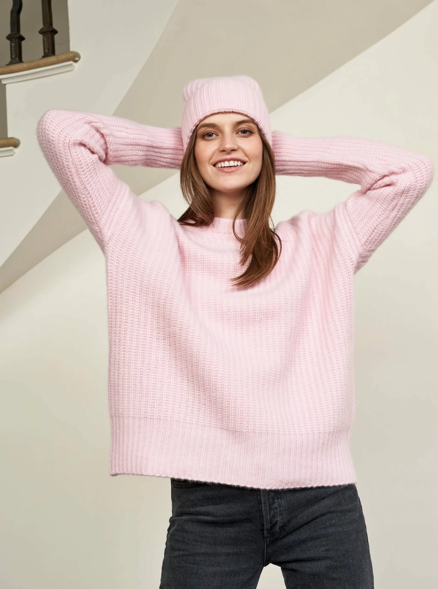 Named after the colorful town of Kinsale, Ireland, this chunky ribbed beanie in pretty pink frosting is a mood all its own.
