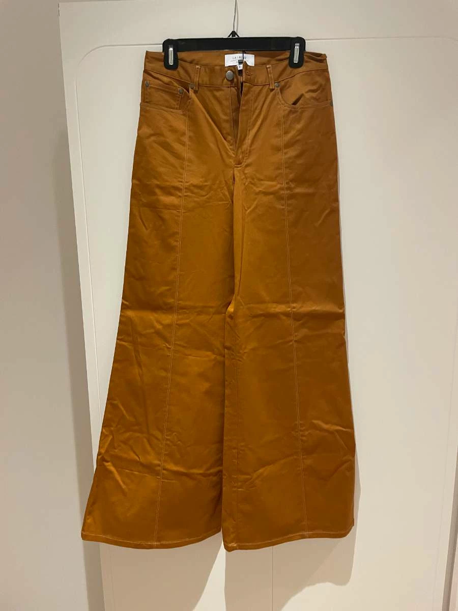 Get in line with our cotton twill wide leg pant in cognac with contrast stitching. The exaggerated flare is the kick your wardrobe wants.Â