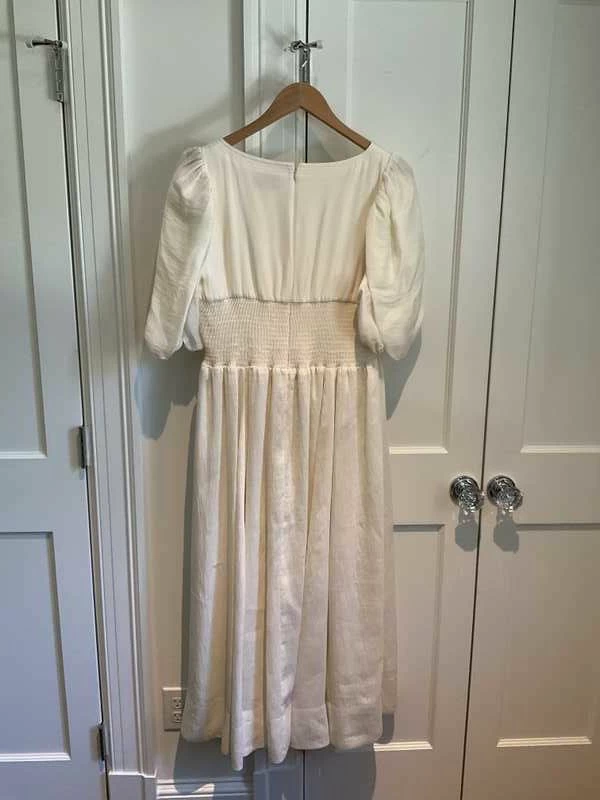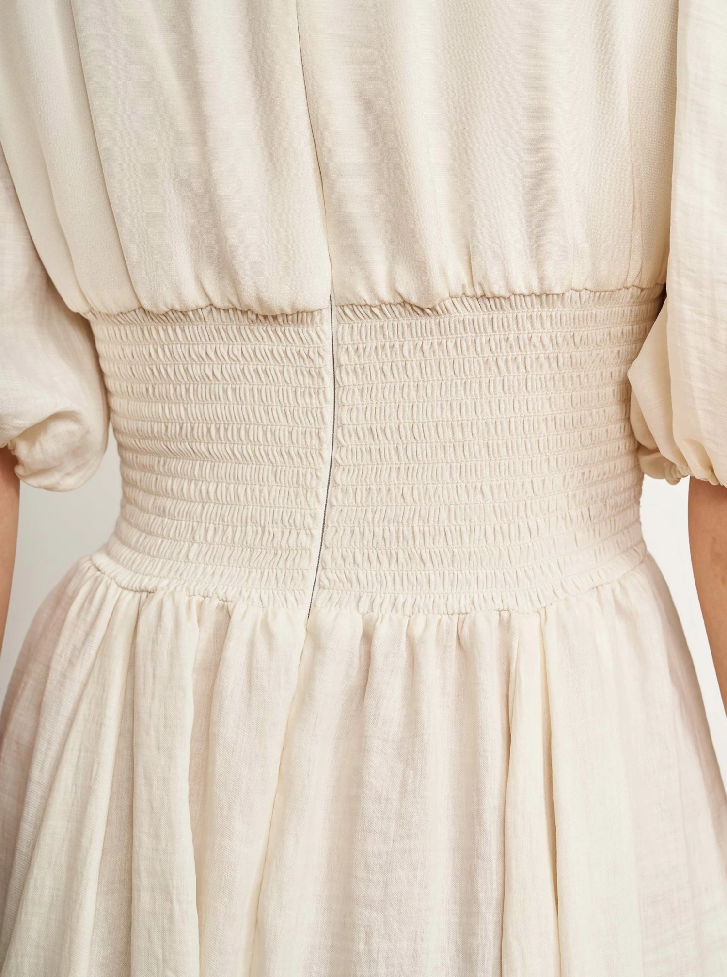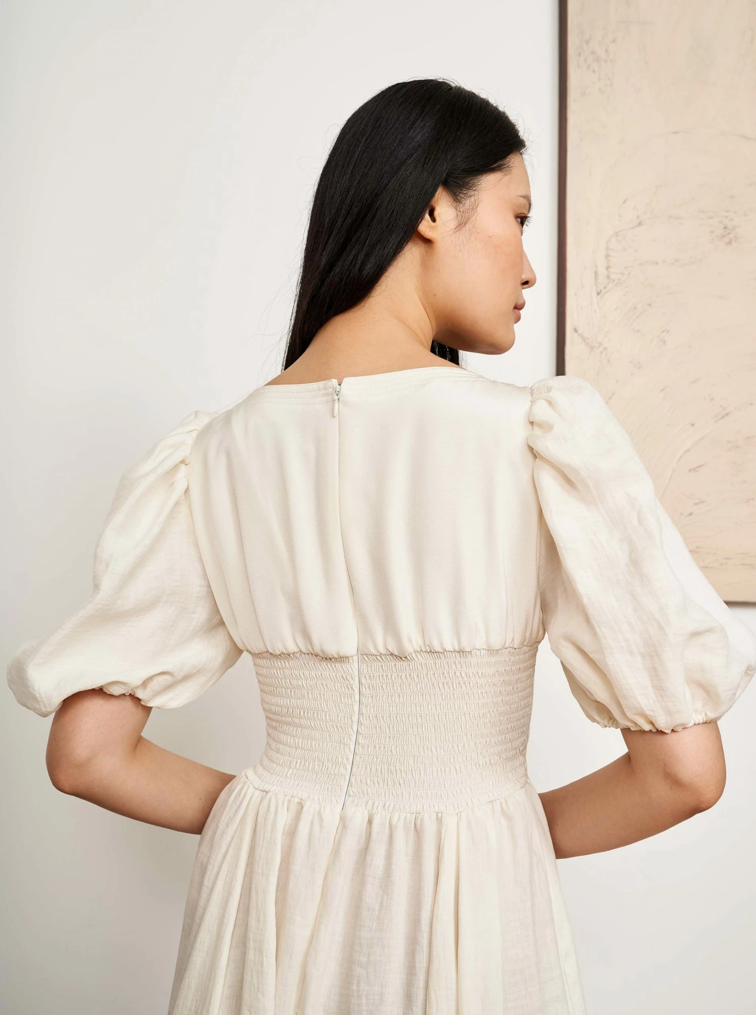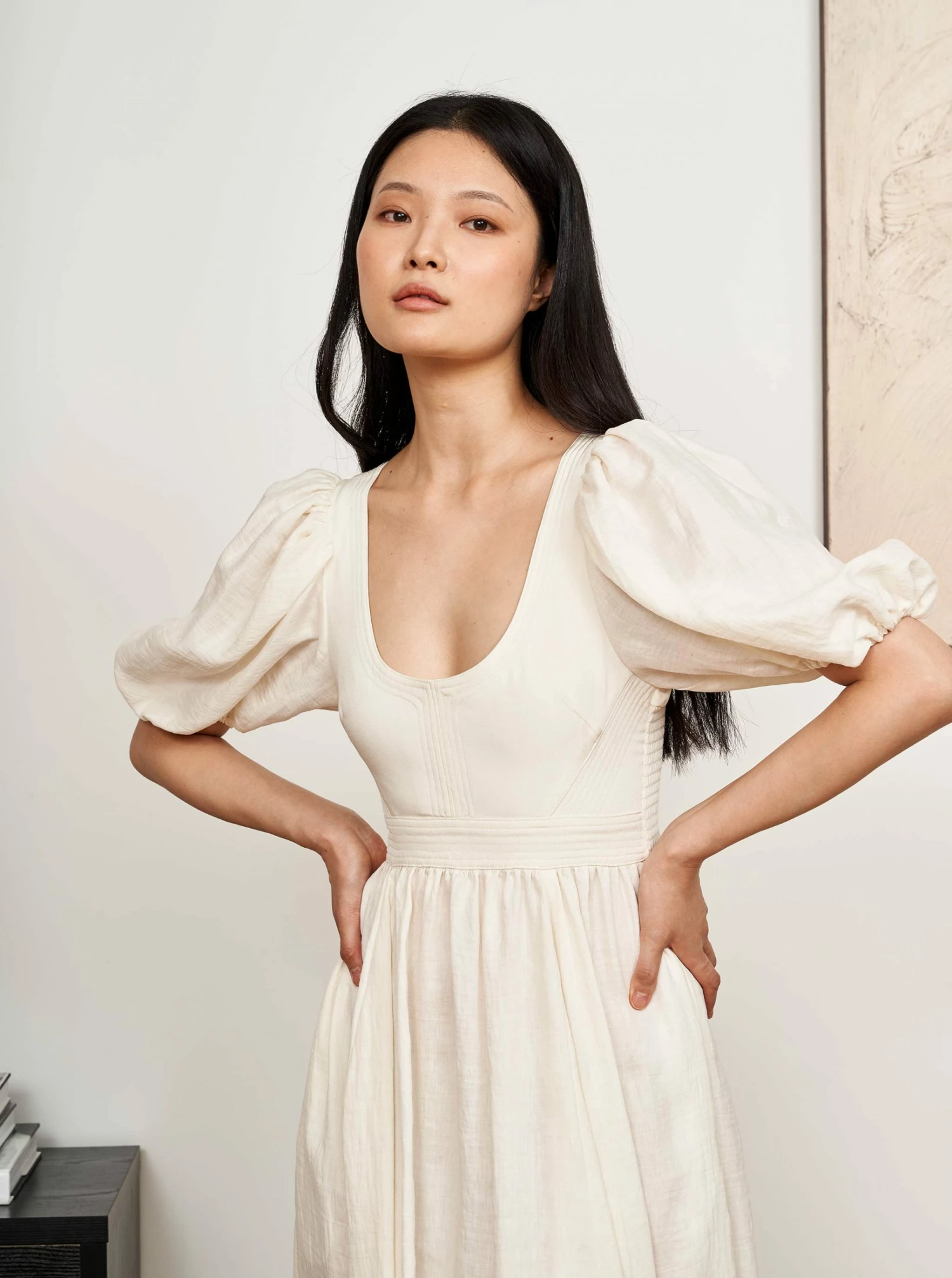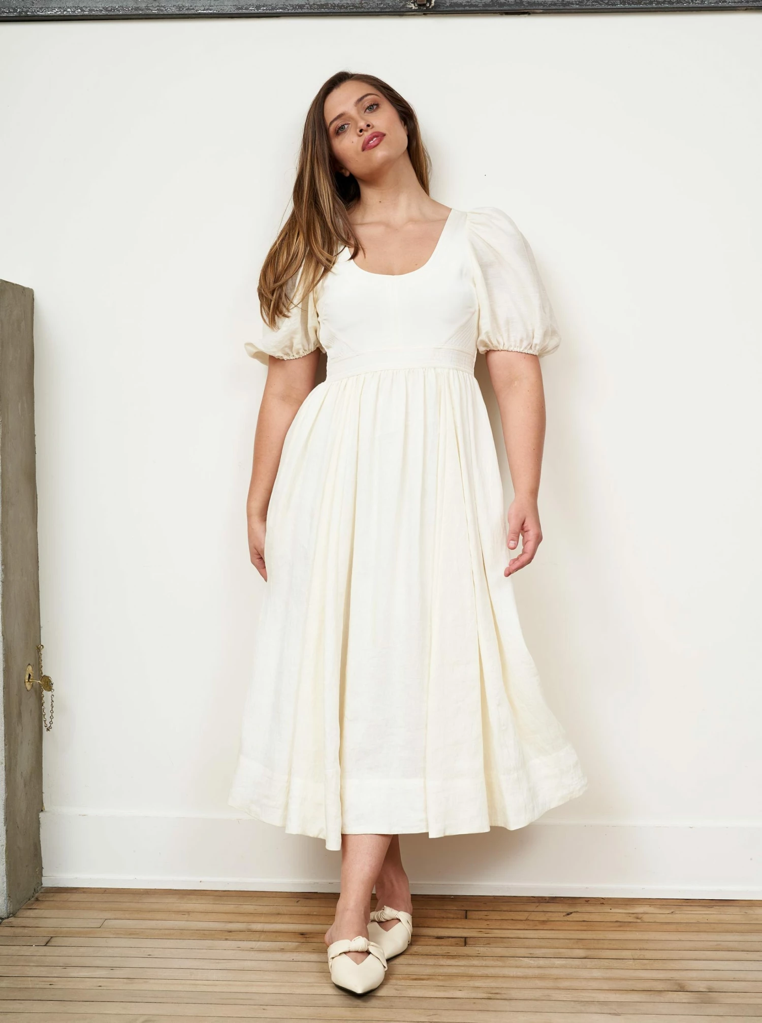 Our most romantic dress is also one of our most versatile. The Daphne Dress in an ivory linen blend features trapunto stitching to create a corset-like bodice which is smocked in the back for comfort. The balloon sleeves with elasticated cuffs and a fully lined skirt make this dress your secret weapon for any of this season’s events.Â