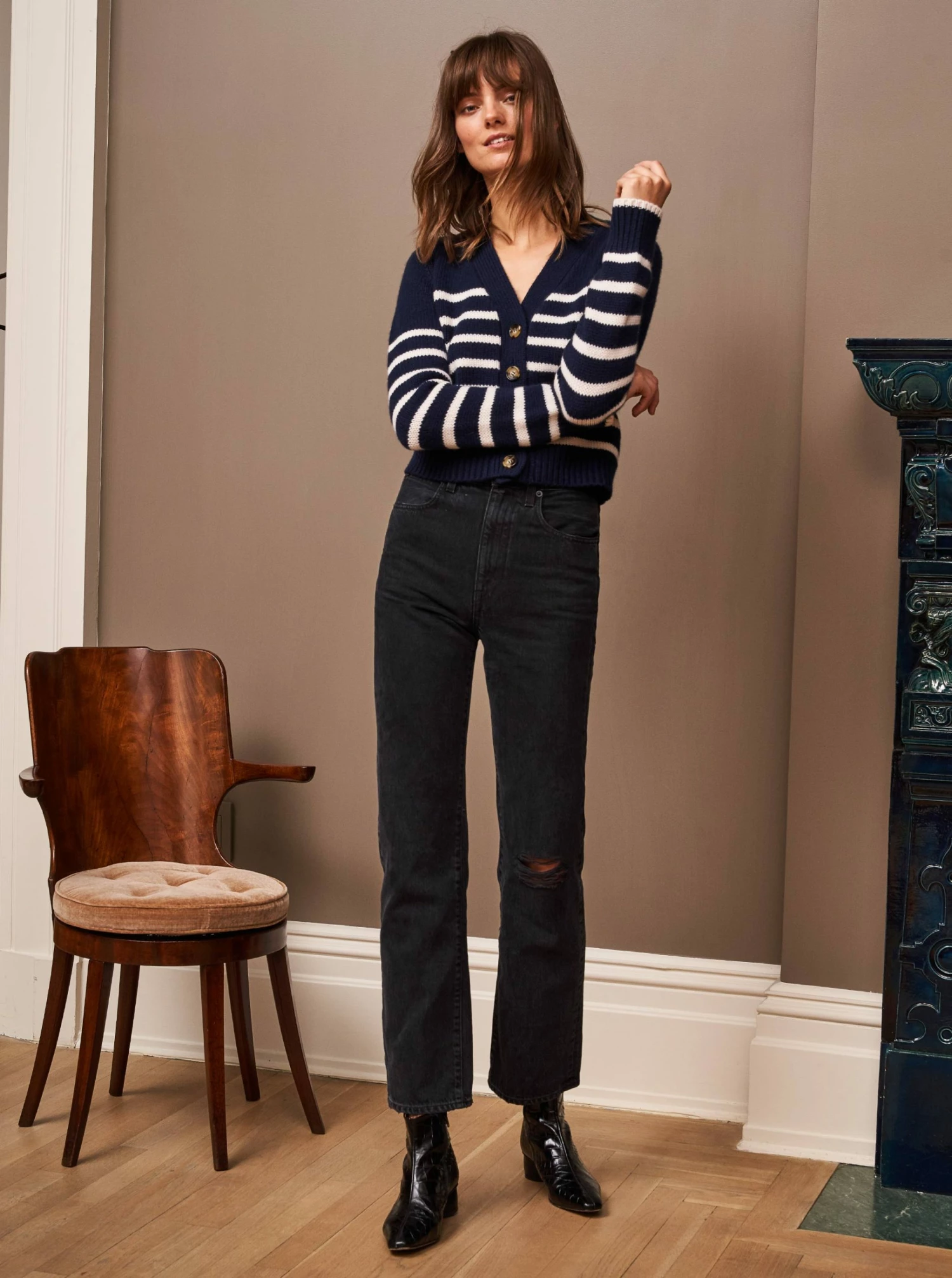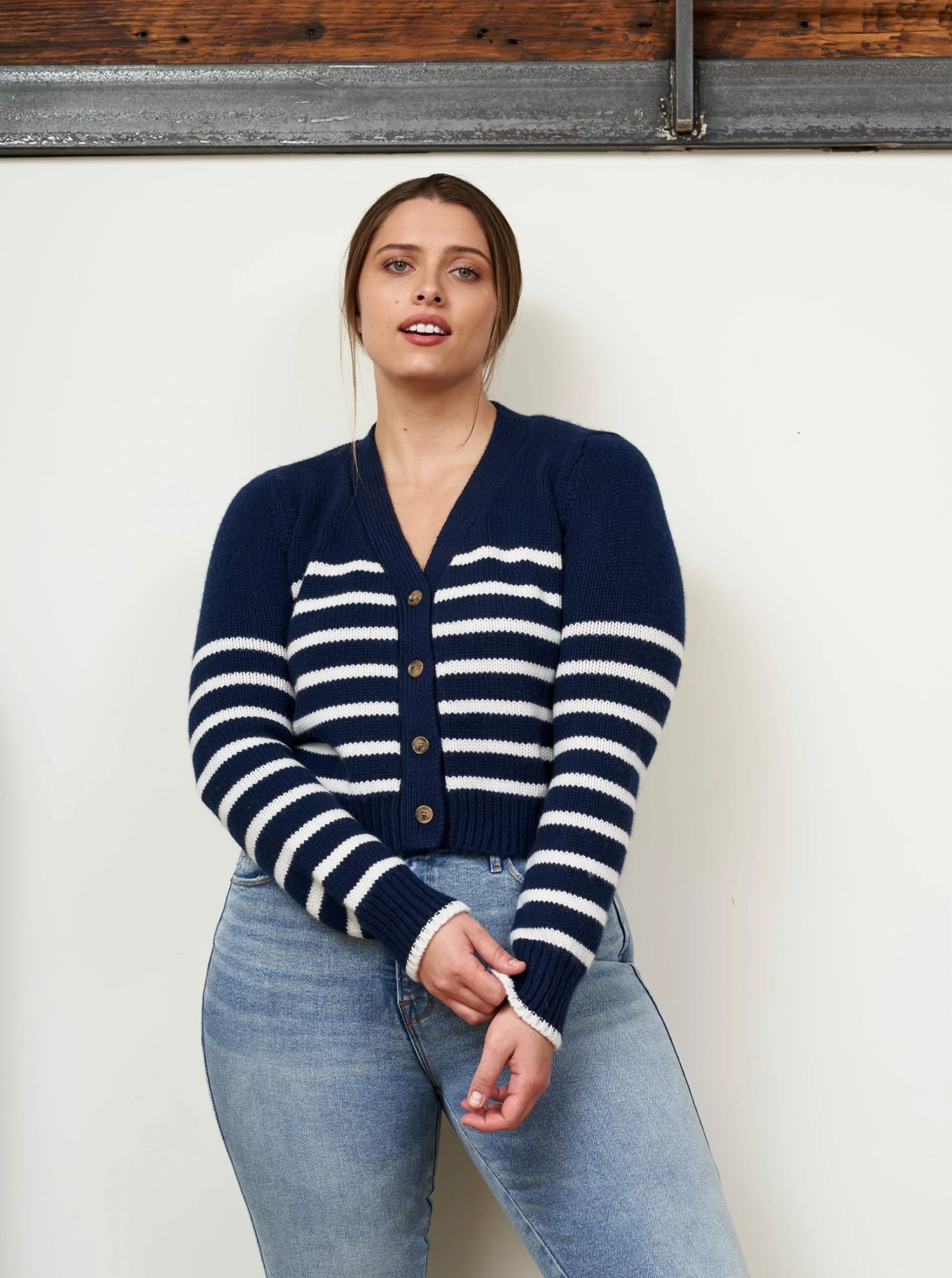 Our newest addition to the Marin family, the Mini Marin Cardigan is just as sweet as sister Mini Marin, with a v neck button front in navy and cream stripes.