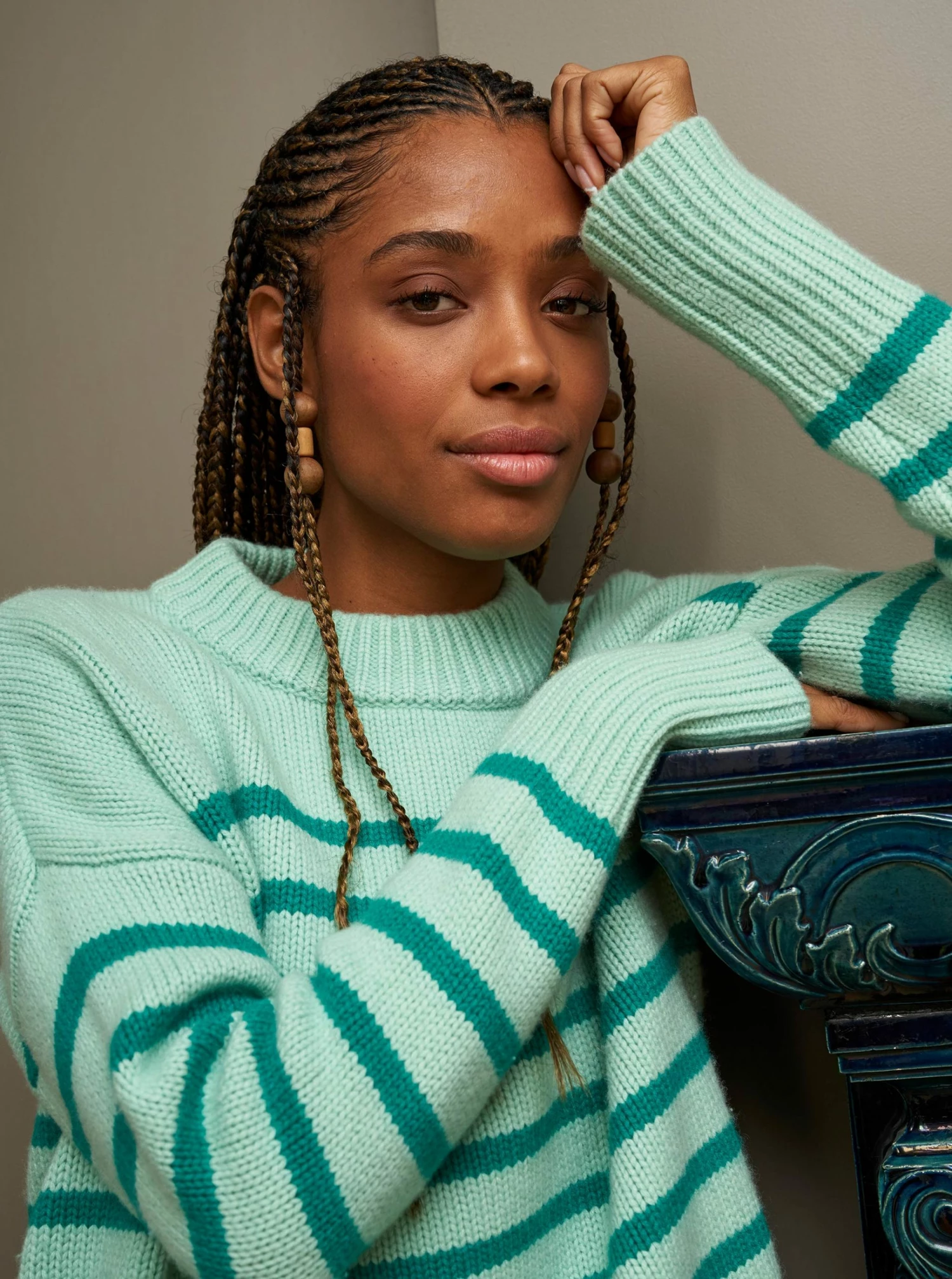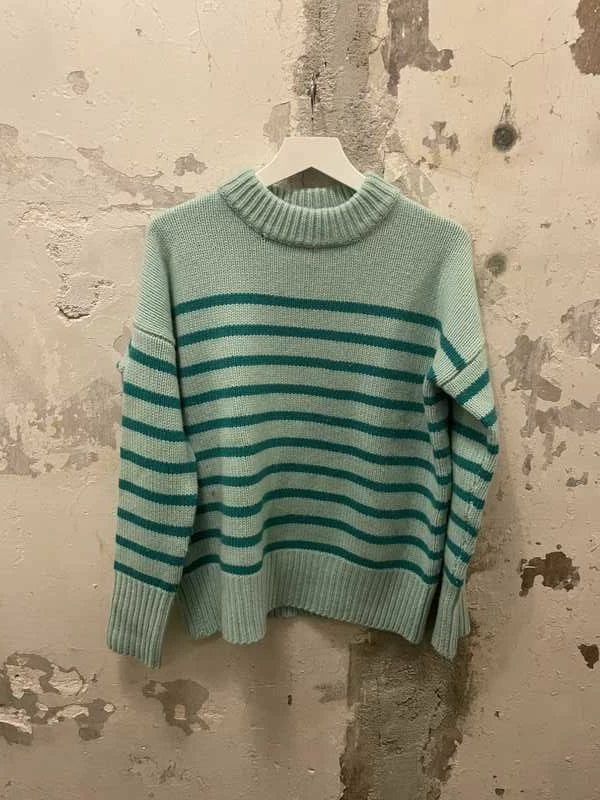 Get on board with our mint and green onyx striped, 7-ply wool-cashmere sweater. Comfort and style, not mutually exclusive.