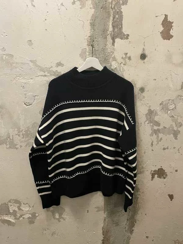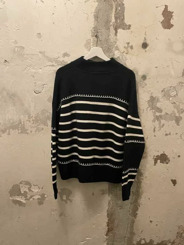 A twist on our classic Marin Sweater, this mockneck features patchwork rib and jersey stripes with blanket stitch details in our signature soft merino.