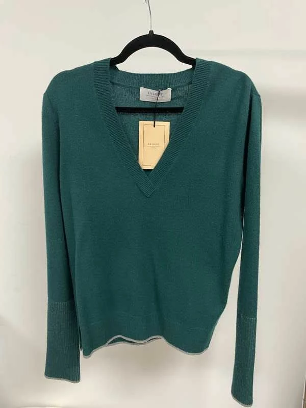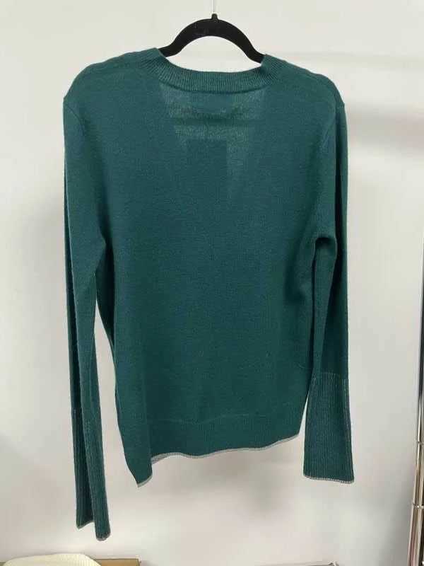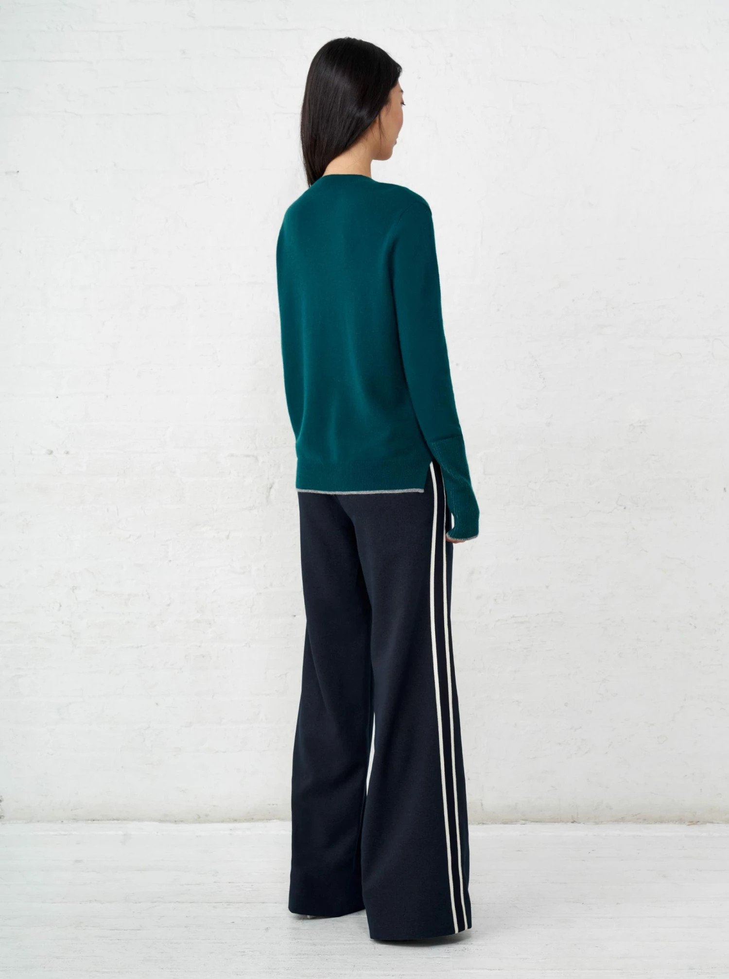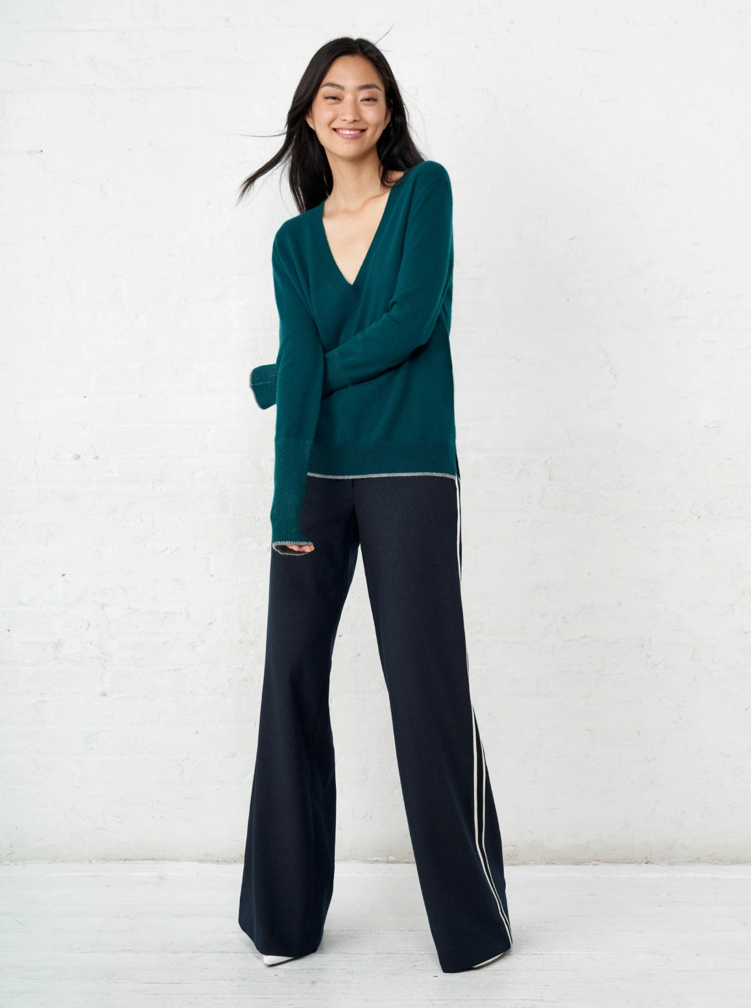 Anytime. Anywhere. Anyplace. You know that piece, the one you hope no one will notice you’ve worn three days in a row? This is that sweater in forest green wool cashmere with elongated sleeves and a deep v. You can thank us later.